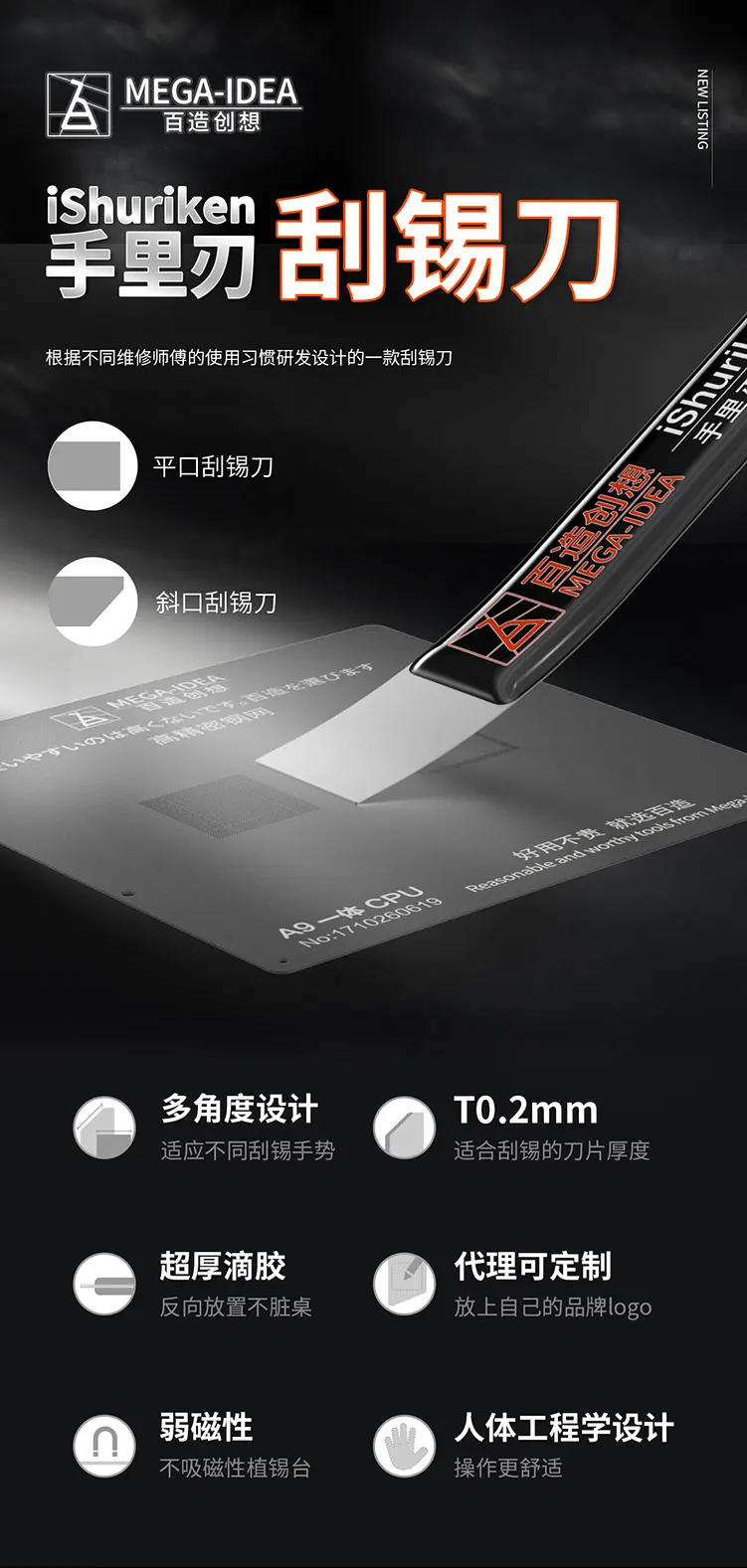 Сверхтонкая лопатка Qianli Mega-Idea t0.2 мм, Оловянная лопатка для реболлинга BGA, скребок iShuriken для рефлектора, инструмент для удаления клея