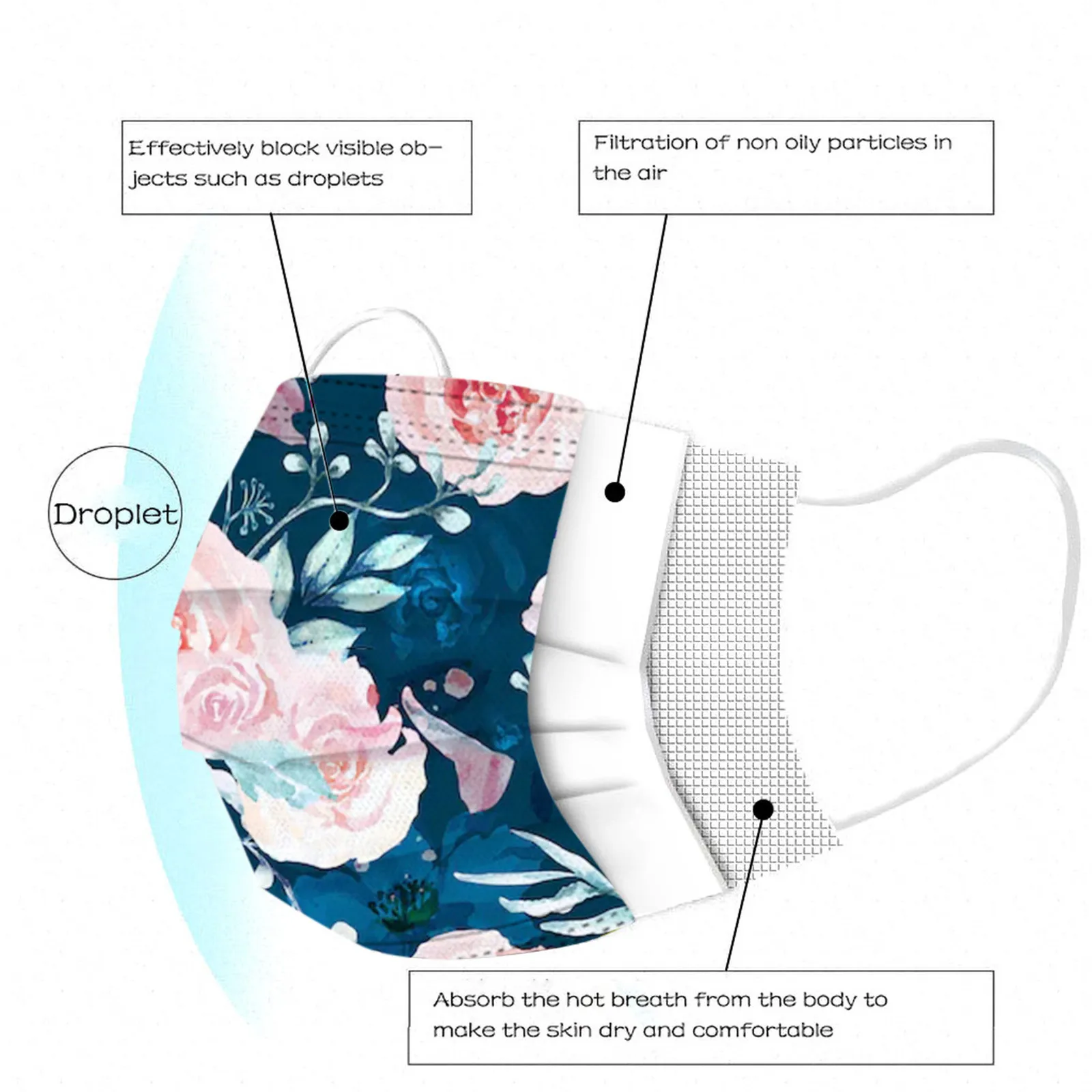 В 3 слоя Нетканая одноразовая маска изготовлена из 3 слоев нетканого материала, Безопасен и безопасен для использования. Дышащий материал и милый Узоры, которые делают его полезным и модным. Специальный 3 слоя из нетканого материала Дизайн, обеспечивает некоторую защиту от пыли, автомобильных выхлопных газов, Пыльца и т. д. эластичная Ушная петля, легко носить и не давит на уши. Маникюрный салон или любые другие области, где может потребоваться защита