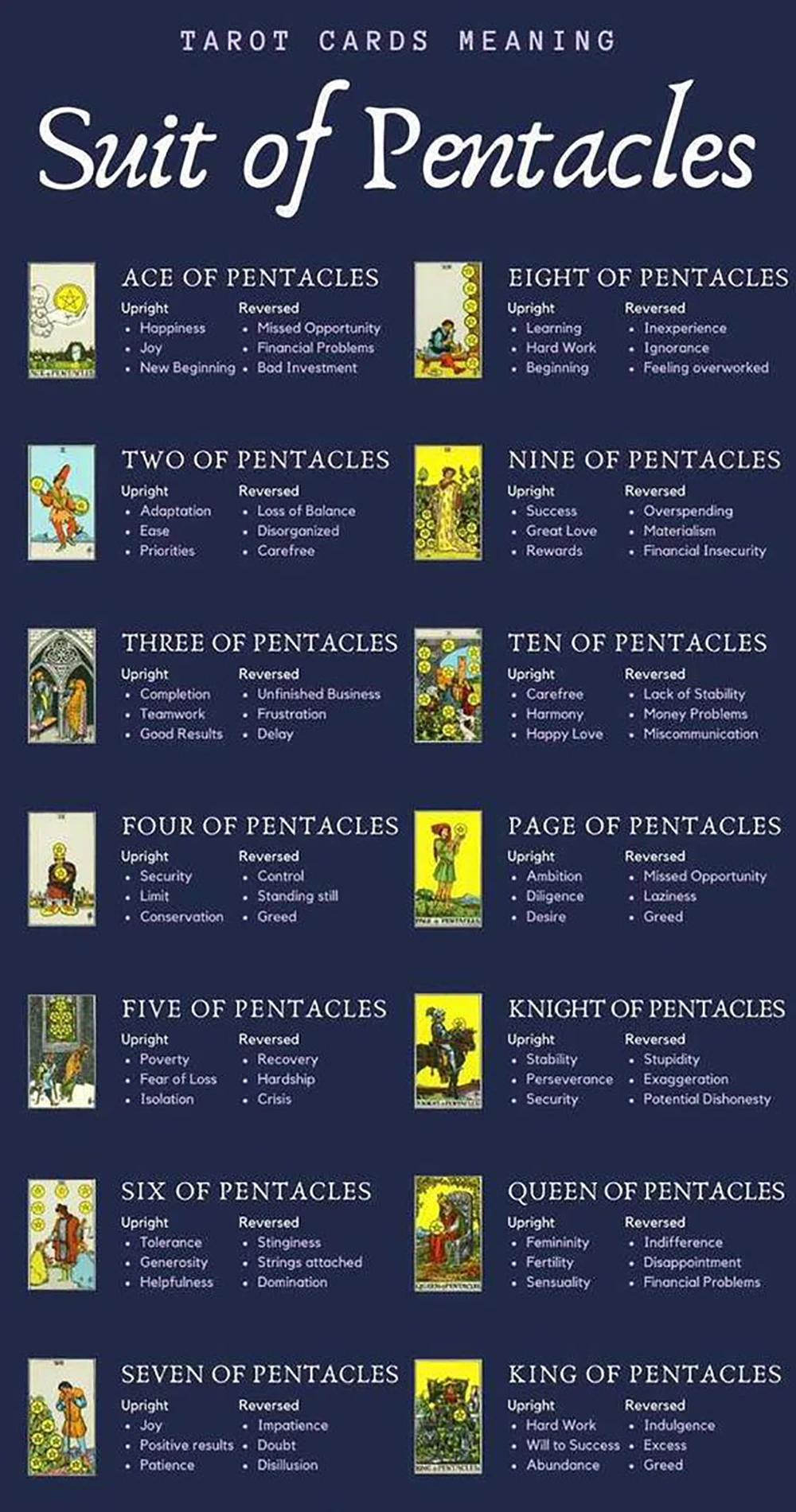 Pentacles соответствуют алмазам в обычной колде карт. Их греческий элемент-air. Они стоят на монетарных вопросах, все об экономии, но также и на мысли, общение и другие вещи разума. В четырех классах феодального общества этот костюм связан с торговлей, торговцами и бизнесменами.