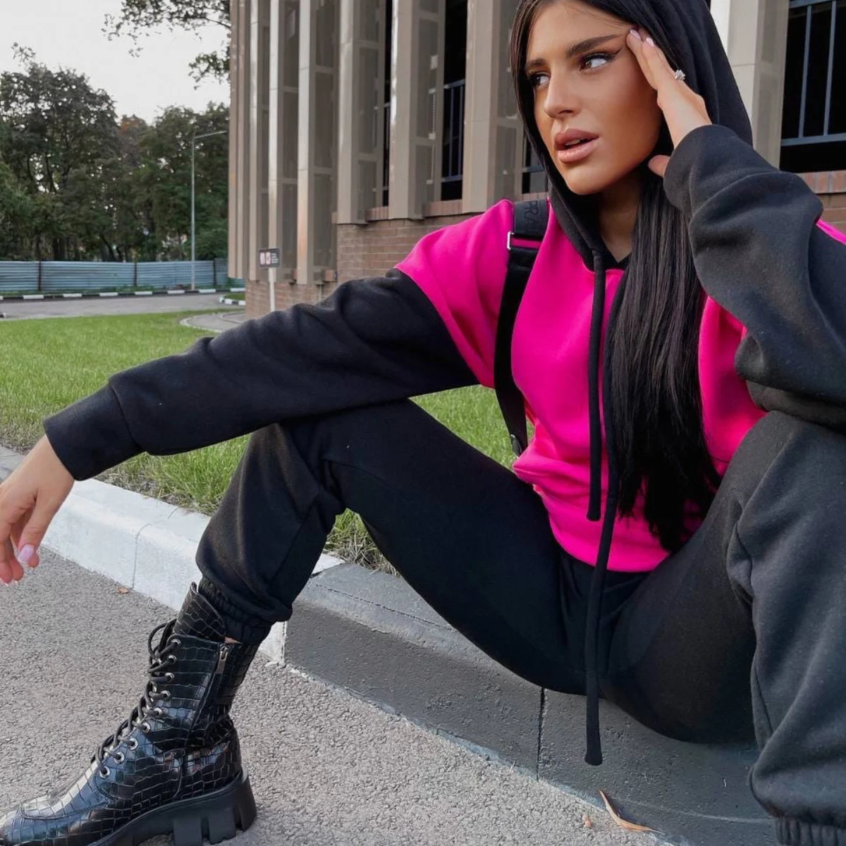 Флисовый женский спортивный костюм с капюшоном, комплект из свитеро...