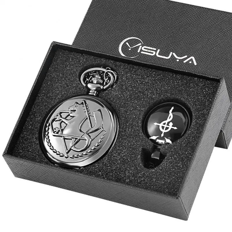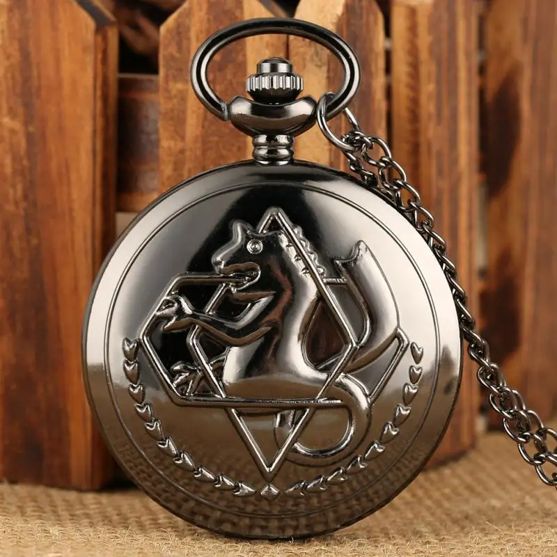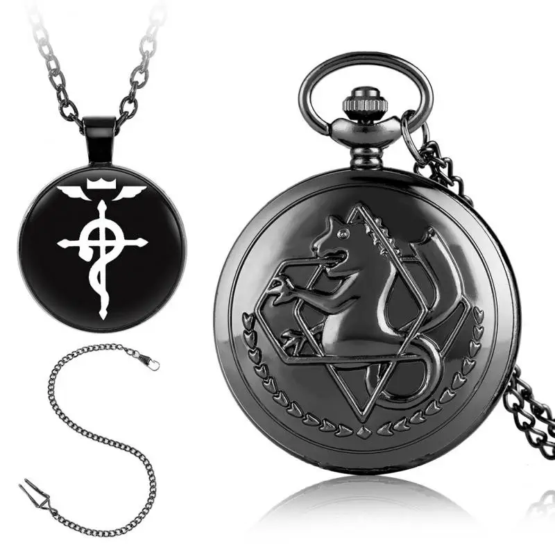 3 шт.компл. Античный Черный Стальной алхимик карманные комплекты с часами Косплей Эдварда Элрика Аниме Кулон разных тонов ожерелье цепь часы подарки