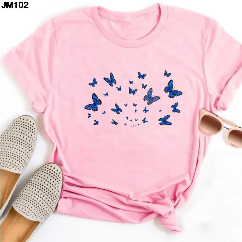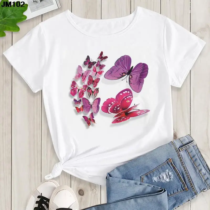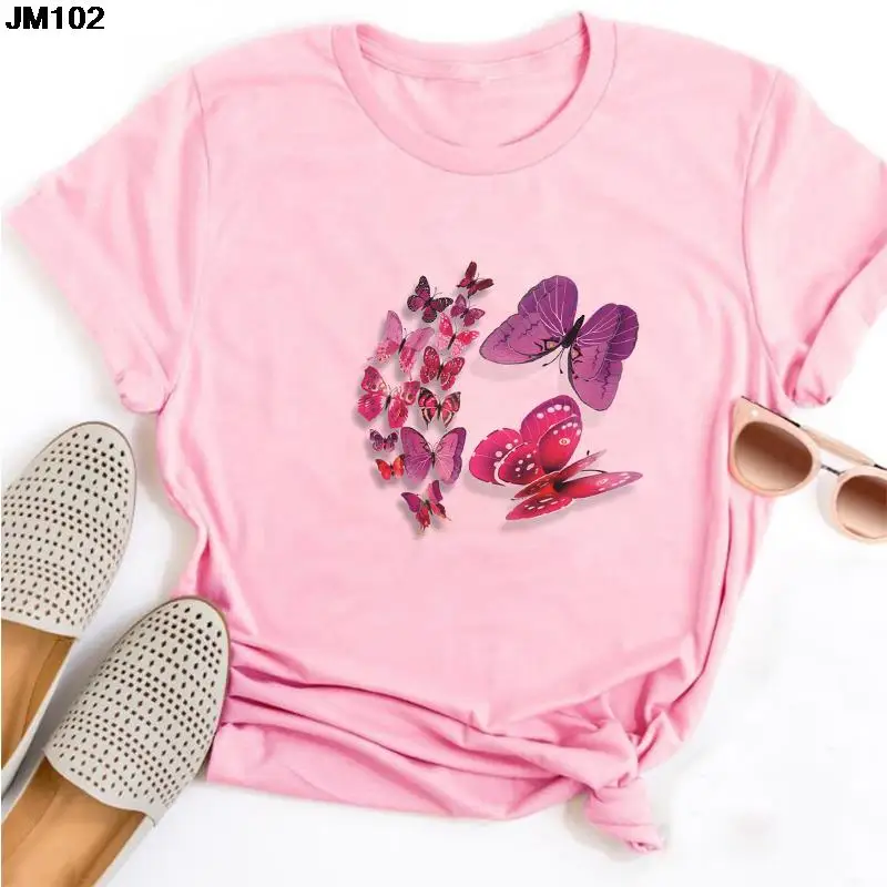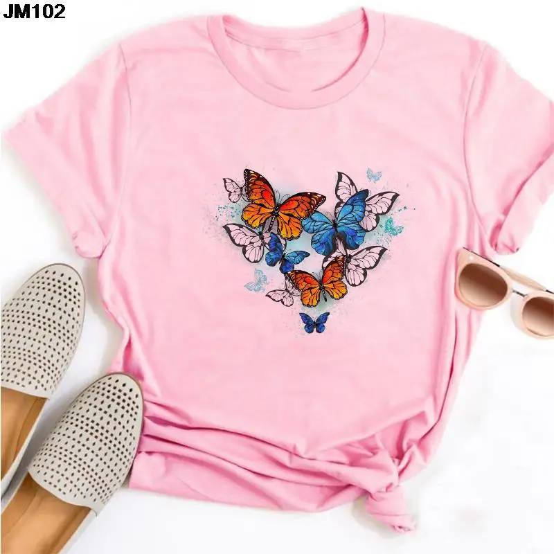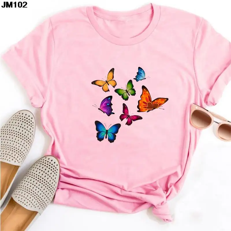 Футболка Harajuku с коротким рукавом, женская футболка с мультяшным принтом бабочки, розовый женский топ, Летняя женская одежда, футболка с графическим рисунком