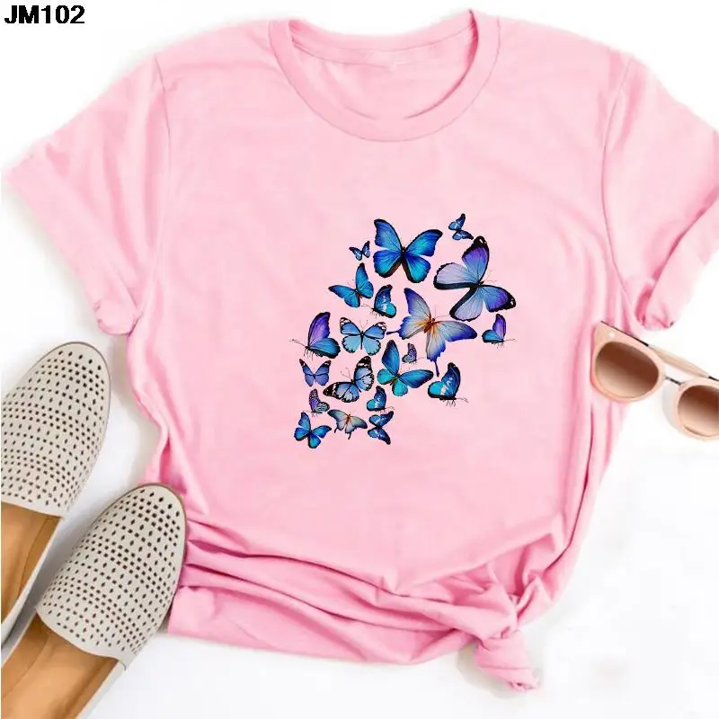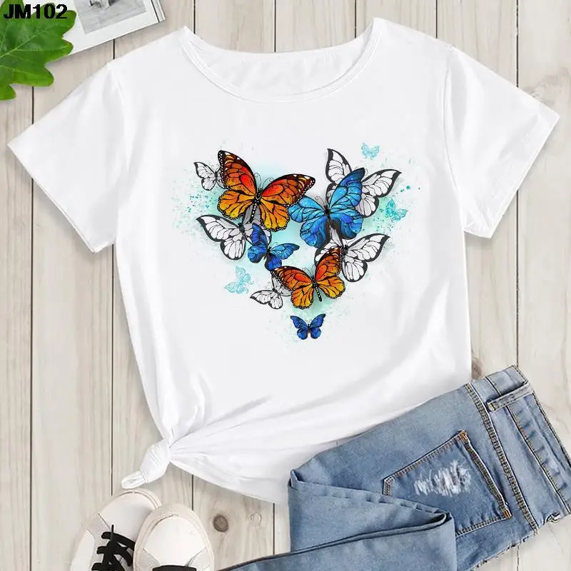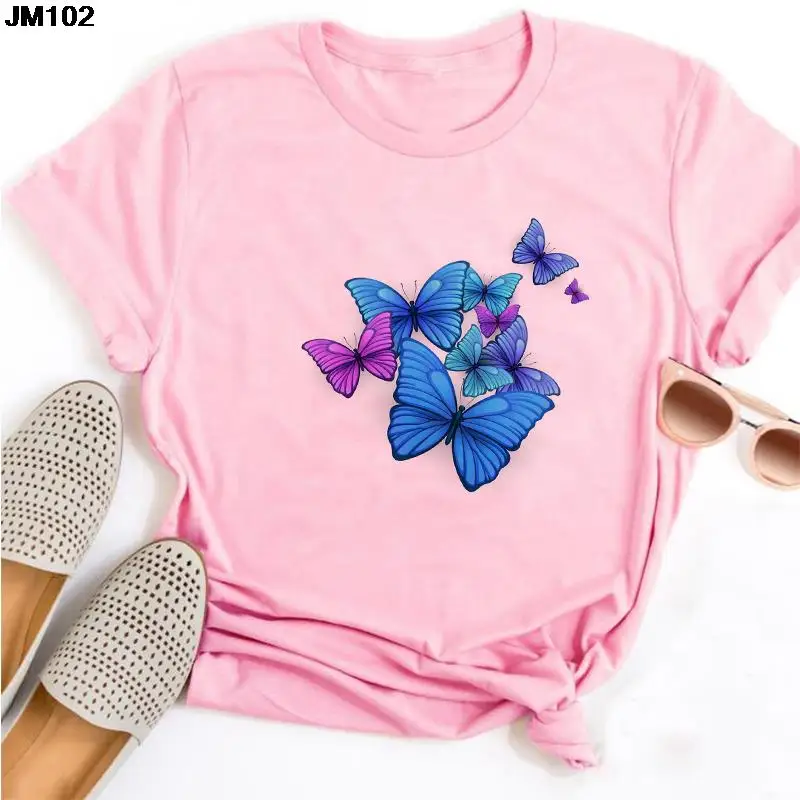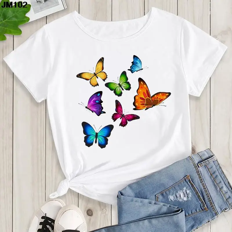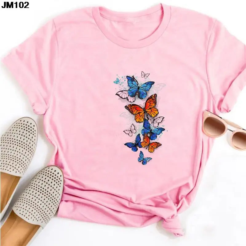 Футболка Harajuku с коротким рукавом, женская футболка с мультяшным принтом бабочки, розовый женский топ, Летняя женская одежда, футболка с графическим рисунком