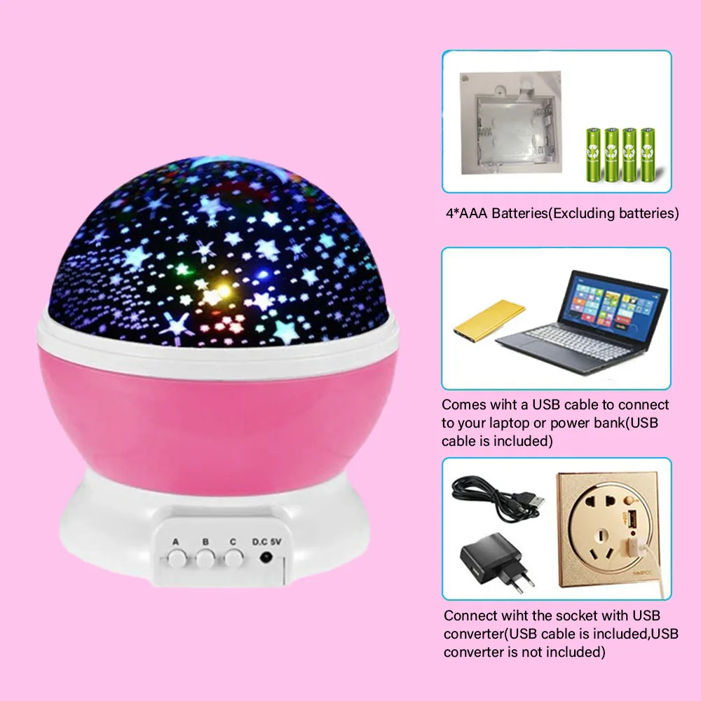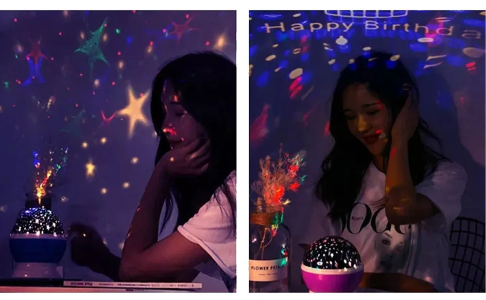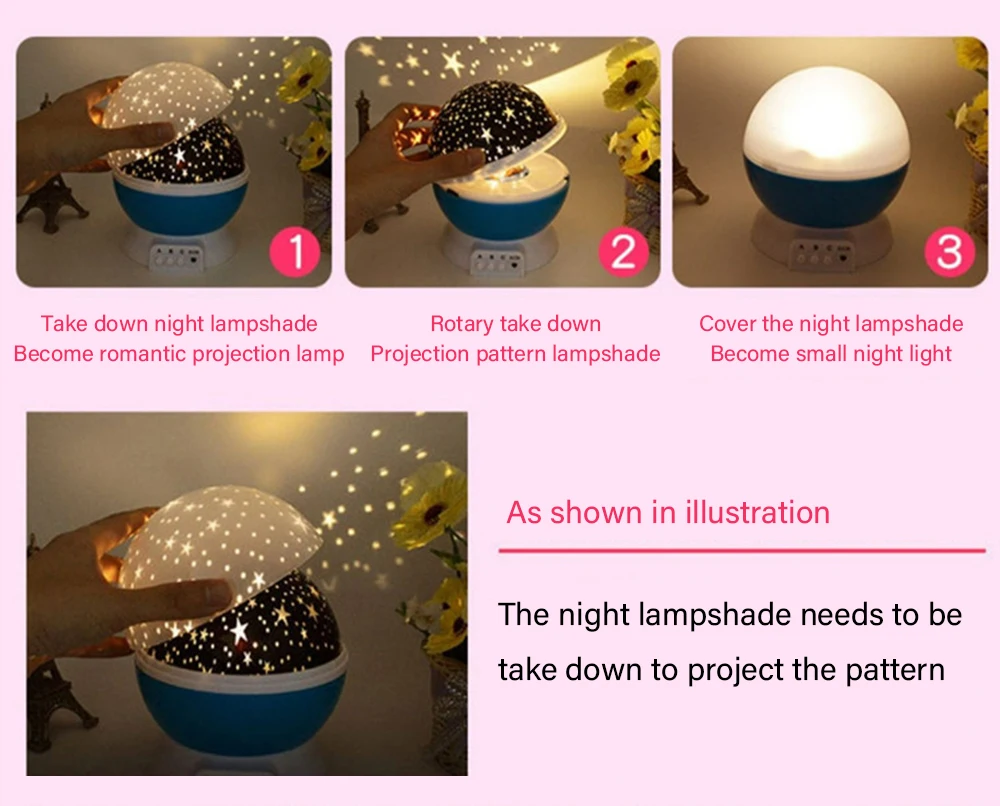 Три модели переключателя: режим-это Ночной светильник, режим B-это светильник, переключающий цвет, режим C-поворотный переключатель, И ночной Светильник режиме светильник теплый белый светильник. После открытия закройте абажур, т. Е. Маленький Ночной светильник. И вы можете свободно управлять режимом, который вы хотите. Встроенный двигатель может вращаться автоматически на 360 °.
