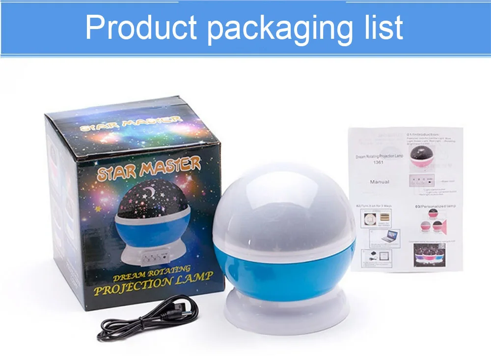 Аксессуары изделия: базовый хост проекционной лампы; Фиксированное кольцо абажура; Полусферическая проекционная пленка с рисунком (снимается при использовании режима Ночной светильник).