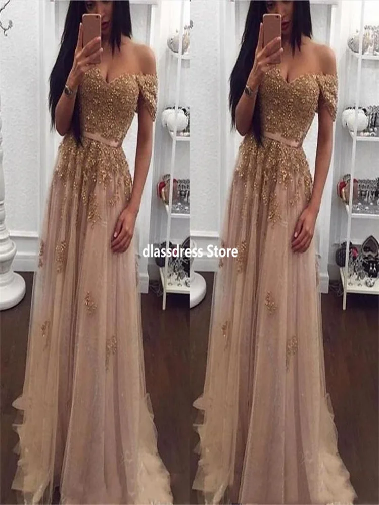 Роскошные вечерние платья цвета шампанского с открытыми плечами, кружевные аппликации из бисера, трапециевидные тюлевые платья для выпускного вечера, винтажные вечерние наряды, Лидер продаж