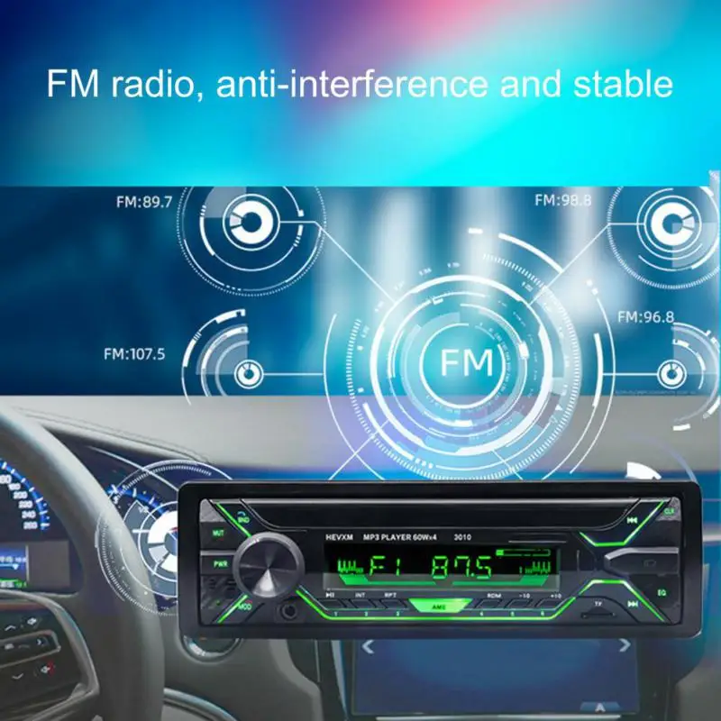 2. Есть мощные функции, такие как hands-free вызов, режим передачи звука, управление приложением сотового телефона, цифровое стерео fm-радио, трехдиапазонный FM1-FM2-FM3 для хранения радио (можно задать 18 станций, FM: 87,5-108 МГц), чтение USB/TF карт, функция воспроизведения папок, дистанционное управление, вращающийся электронный регулятор громкости, Спереди с разъемом подачи внешнего сигнала AUX входного отверстия, сзади L/R аудио RCA выходное отверстие, 4-канальная, высокая выходная мощность, цвет светильник светодиодный дисплей.