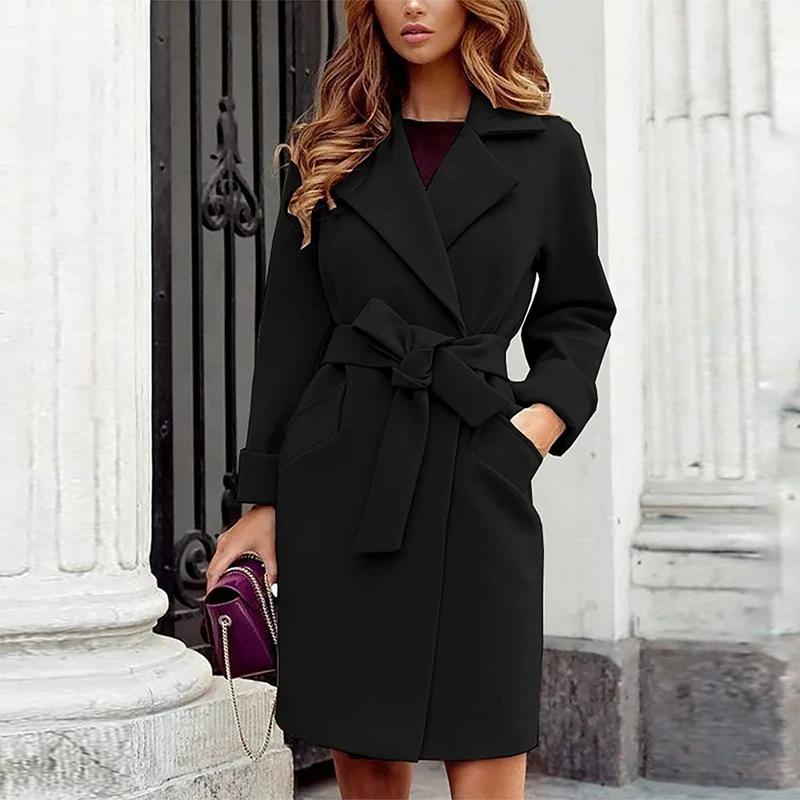Женское шерстяное однотонное пальто с отложным воротником, длинным рукавом и поясом на талию, зимняя куртка, модная женская зимняя верхняя одежда