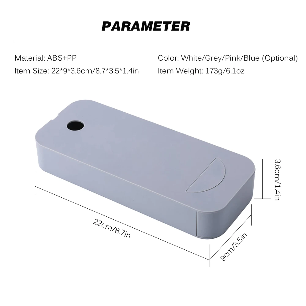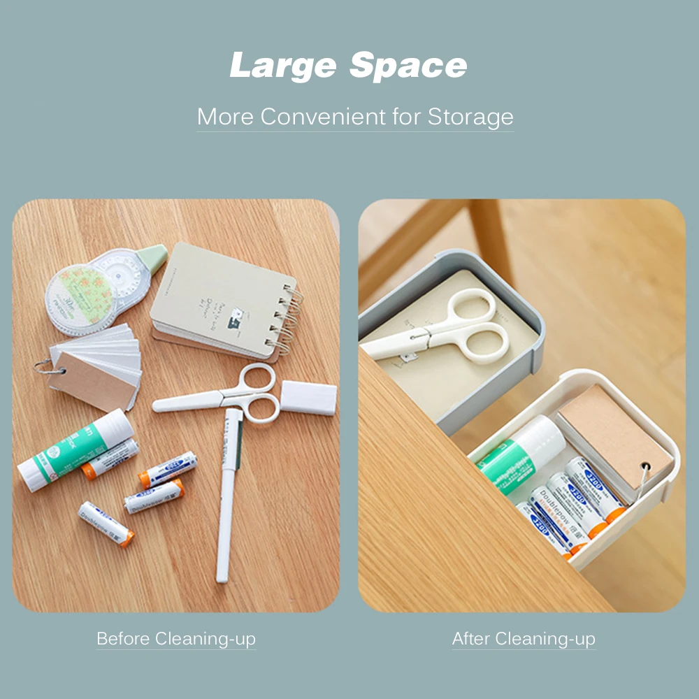 Особенности: Высококачественный материал. Он изготовлен из экологически чистого пластика без содержания свинца, что делает его прочным и долговечным для ежедневного использования. Невидимый дизайн для хранения. Он помещается в нижней части стола в невидимой форме, которая не только не занимает места, но и дает вам некоторую конфиденциальность для сбора ваших товаров. Большая емкость для хранения. Вы можете поместить в него много предметов, таких как ручки, мобильные телефоны, линейки наушников и другие принадлежности. Эффективный чистый рабочий стол. Поставив товары в ящик для хранения, вы можете наслаждаться чистым рабочим столом, который имеет большое пространство. Многофункциональный. Он может быть широко использован в вашей повседневной жизни. Вы можете выбрать, чтобы положить его на стол или вставить его в нижней части, оторвав защитную пленку. Характеристики: Материал: АБС + ПП Цвет: белый/серый/розовый/синий (опционально) Размер изделия: 22*9*3,6 см/8,7*3,5 * 1.4in Товар Вес: 173g/6,1 oz Посылка Размеры: 22,5*9,5*4 см/8,9*3,7 * 1.6in Вес посылка: 198 г/7 унций Посылка: 1 * коробка для хранения