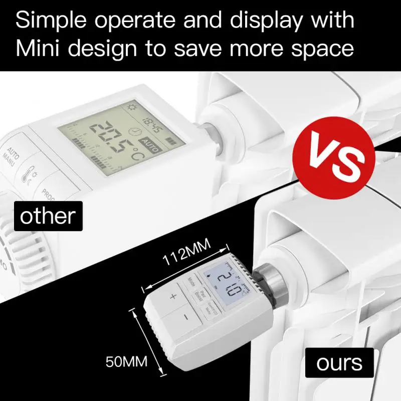 1. Новый мягкий трогательный дизайн с гуманизированными обновлениями: новый элегантный мини-дизайн с чрезвычайно четким светодиодным дисплеем на его теле и более широким видением для удобного чтения; Две секции аккумуляторов AA, который является специальным клапаном, использующим вместе с нагревательным радиатором для контроля закрытия и открытия трубы для более комфортной комнатной температуры.
