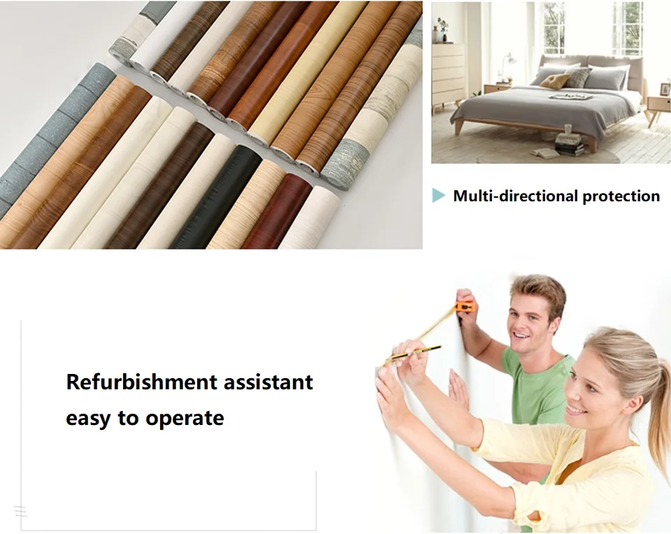 1. Перед наклеиванием убедитесь, что поверхность чистая, сухая и гладкая.2. Измерьте точный размер поверхности и отрежьте деревянное зерно контактной бумаги соответственно.3. Снимите часть с одного угла, не прикасаясь к клею.4. Линия вверх, медленно и равномерно приклейте его к поверхности.5. Снимите бумагу на спине постепенно и слегка Разгладьте пузырьки скребком.
