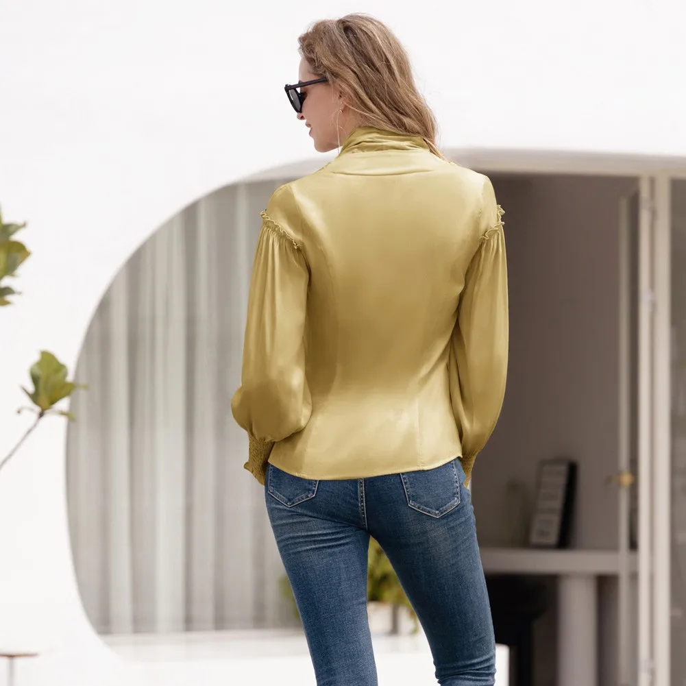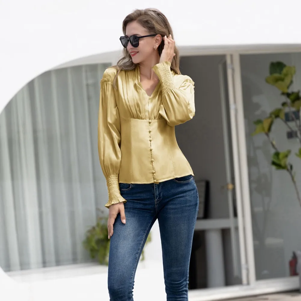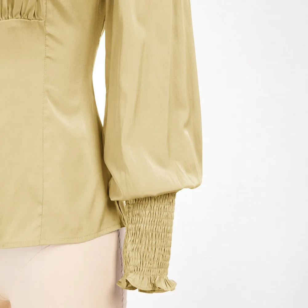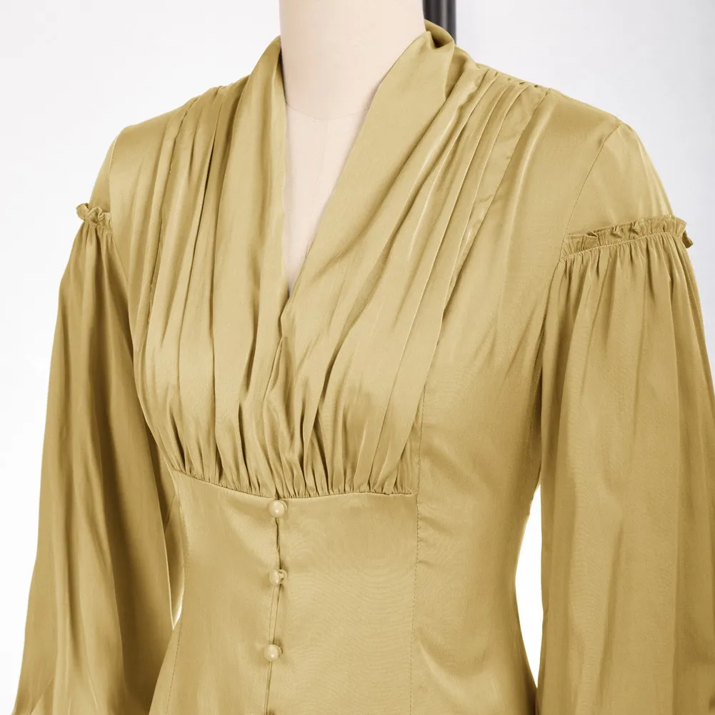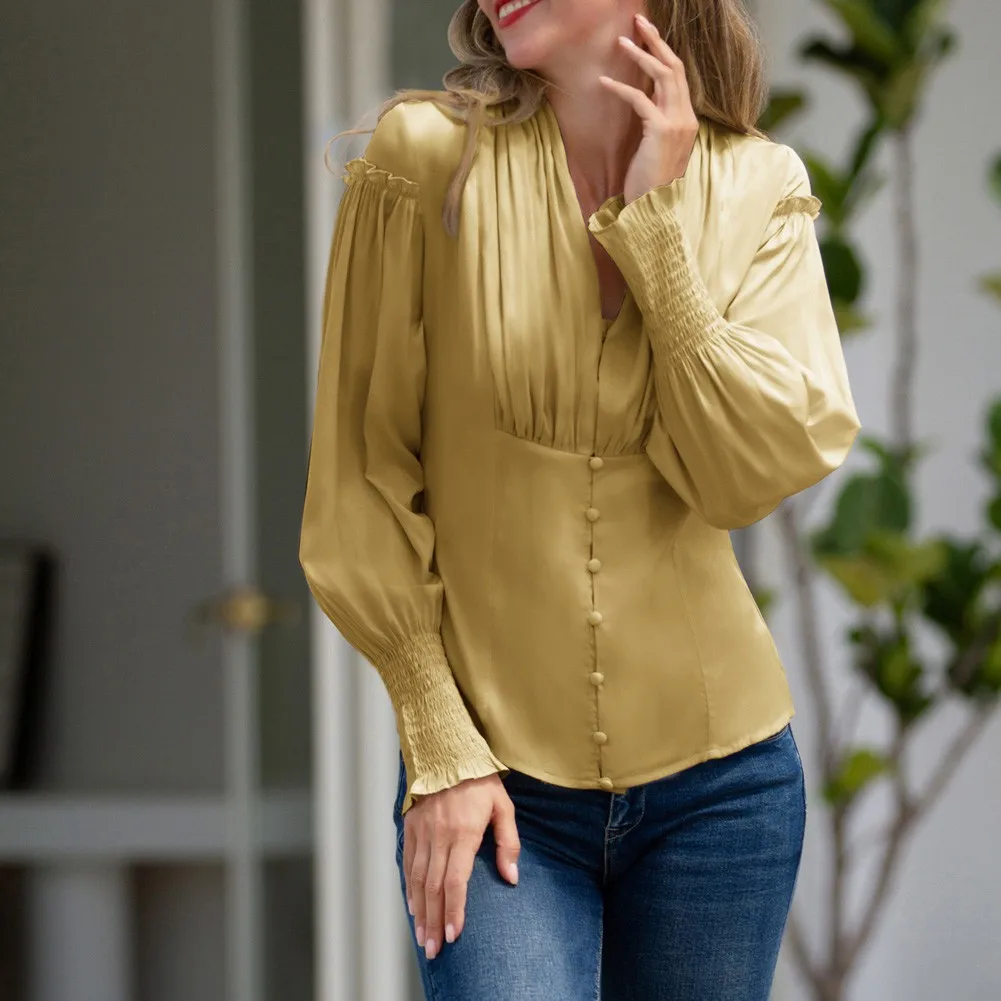 Женская рубашка с рюшами, длинными рукавами-фонариками и V-образным вырезом