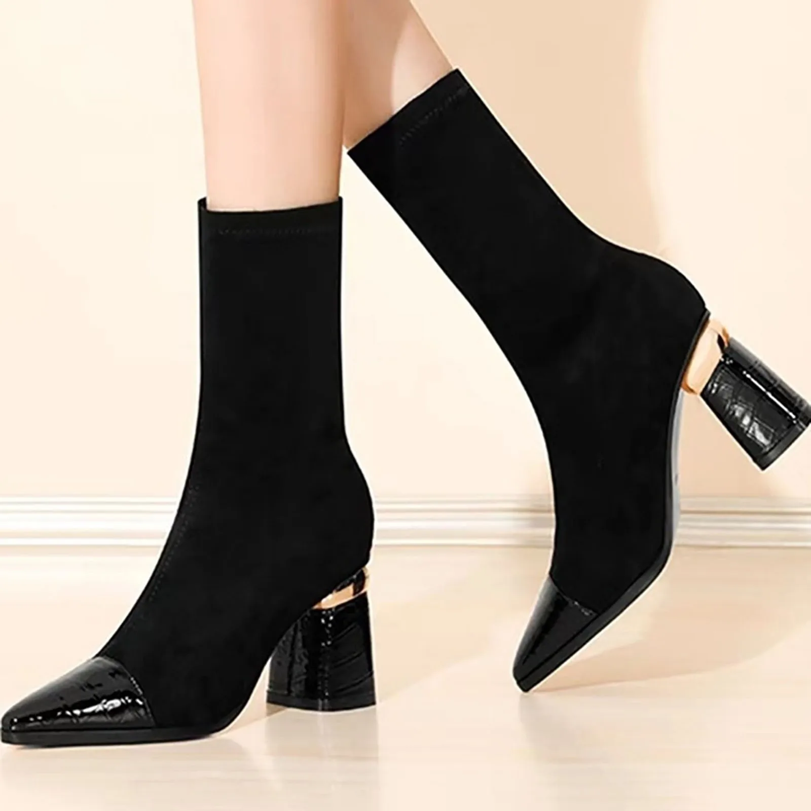 Женские ботинки, сезон осень-зима, женские модные эластичные ботинки на высоком каблуке с острым носком, вязаные ботинки-лодочки без застежек, 2021