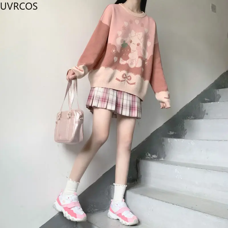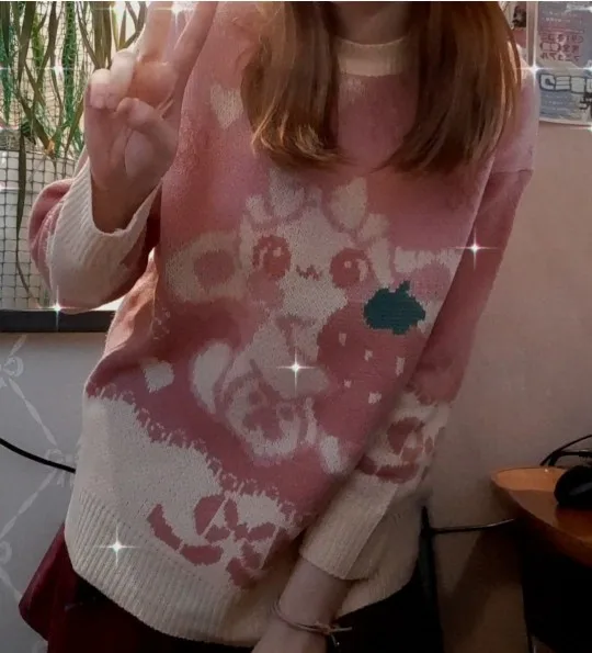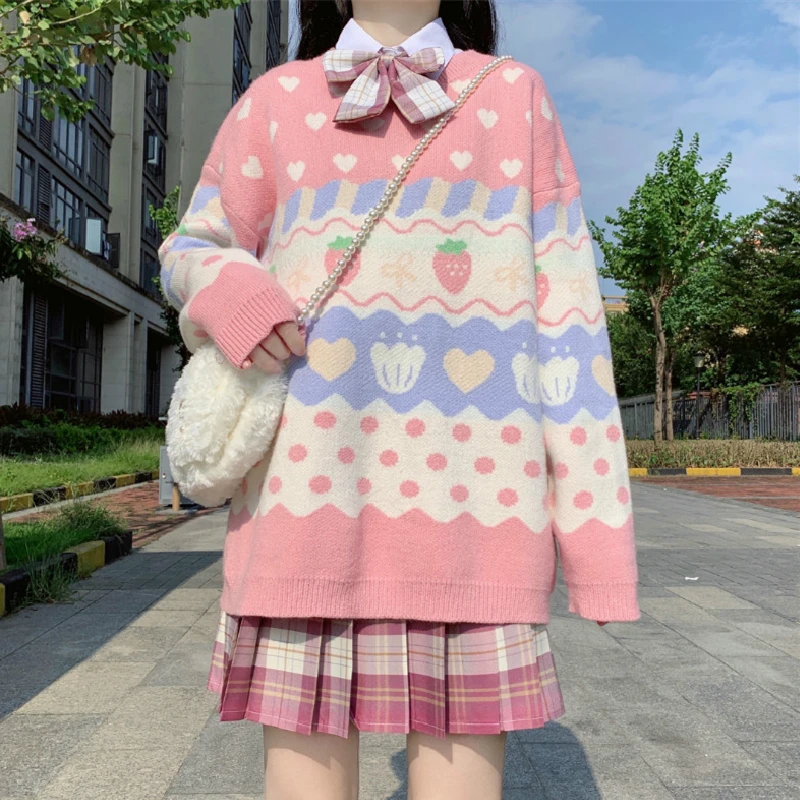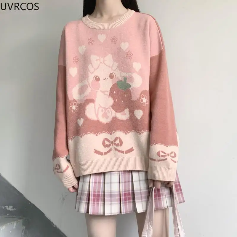 Этот свитер Lolita-новый женский вязаный свитер Lolita с милым принтом, разработанный дизайнером. Очень милый японский Свободный пуловер с клубничкой