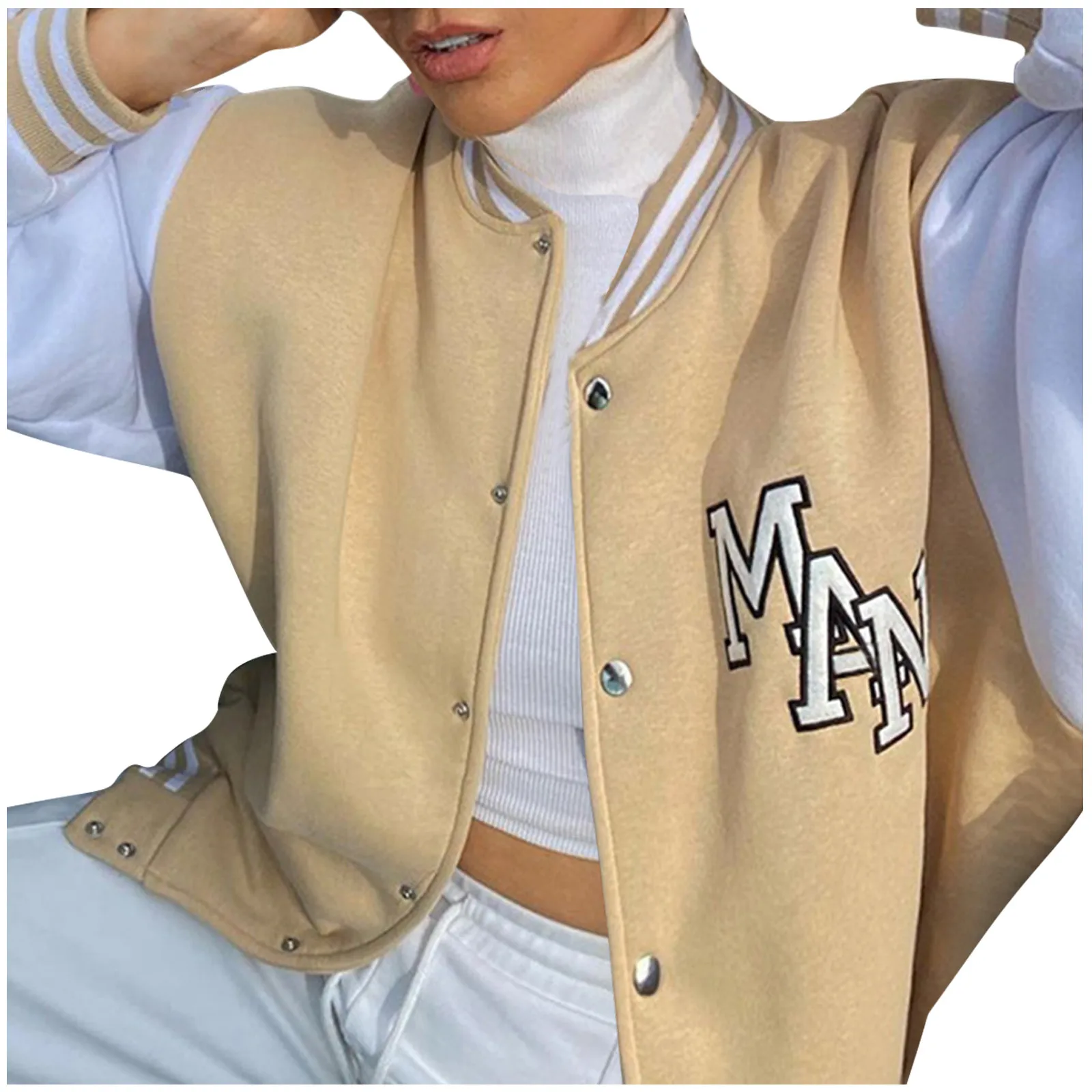 Женская бейсбольная куртка, укороченная куртка цвета хаки с длинным рукавом и буквенным принтом, куртка-бомбер в стиле пэчворк на осень и зиму