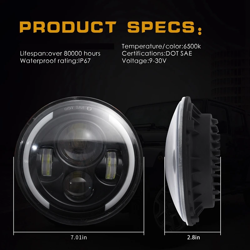 Светодиодный фонарь с DRL Halo Angel Eyes в сборе.Круглый светодиодный фонарь Halo имеет функцию ближнего света, дальнего света и DRL.Идеально запечатано, чтобы предотвратить накопление влаги и воды.7 дюймов круглые фары предназначены для универсального назначения.Могут быть применены к внедорожники, проектные транспортные средства, ГИДРОЦИКЛ, внедорожная радиальные внедорожные шины 4x4, горная техника, тяжелое оборудование, габаритные огни для грузовиков, для джипов, мотоциклы, снегоход и т. д.Установка для автомобиля:Подходит для Jeep Wrangler TJ 2 Door 1997 ~ 2006Для Jeep Wrangler LJ unlimited (4 двери) 2004 ~ 2006Для Jeep Wrangler JK 2 Door 2 2007 ~ 2018Для Jeep CJ-8 скремблер 1981-1985Напряжение: DC9V-30VЦветовая температура: 6000KСветодиодный источник питания: 20 ВтЛуч: дальний и ближний свет + DRL + сигнал поворотаСрок службы: 80000 + часовЦвет глаз ангела: янтарный или белый, вы можете изменить его самостоятельноНовейший дизайн: фары с ангельскими глазками HaloСтепень водонепроницаемости: IP67Цвет: черныйМатериал: алюминийРазмер: 178x178x71ммПосылка:1 светодиодный фонарь1x жгут проводовТолько вышеуказанная посылка, другие товары не включены.Примечание: светильник и различные дисплеи могут привести к тому, что цвет товара на картинке немного отличается от реального. Допускается погрешность в измерениях +/- 1-3 см.