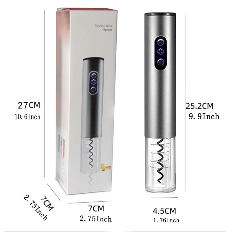 Особенности:-Сияющий цвет и модный внешний вид, вечерние, свадебные и домашние-Откройте вино за 6 - 8 секунд-Совместимость с перезаряжаемый аккумулятор и AA щелочная батарея (не включена)-Купить перезаряжаемые модели USB, отправить кабели данных-Прозрачная крышка штопора для просмотра пробки-Пищевой винт, безопасный и прочный-Легко работающие кнопки для нажатия и вытяжки пробки-Корпус из алюминиевого сплава и прозрачная крышка из АБС-пластика-Низкий уровень рабочего шума менее 75 дБ-Мощность: 5 Вт-Номинальное напряжение: 6 ВТип металла: алюминиевый сплавТип открывалки: красное вино, винные открывалкиВес изделия: 0,358 кгПосылка:Посылка 1 (зарядка аккумулятора):1 Электрический Нож для вина, 1 фольга, 1 руководство пользователя на китайском и английском языках (без батареи)Посылка 2 (зарядка через USB):1 Электрический Нож для вина, 1 фольга, 1 руководство пользователя на китайском и английском языках, 1 usb-кабель для передачи данных