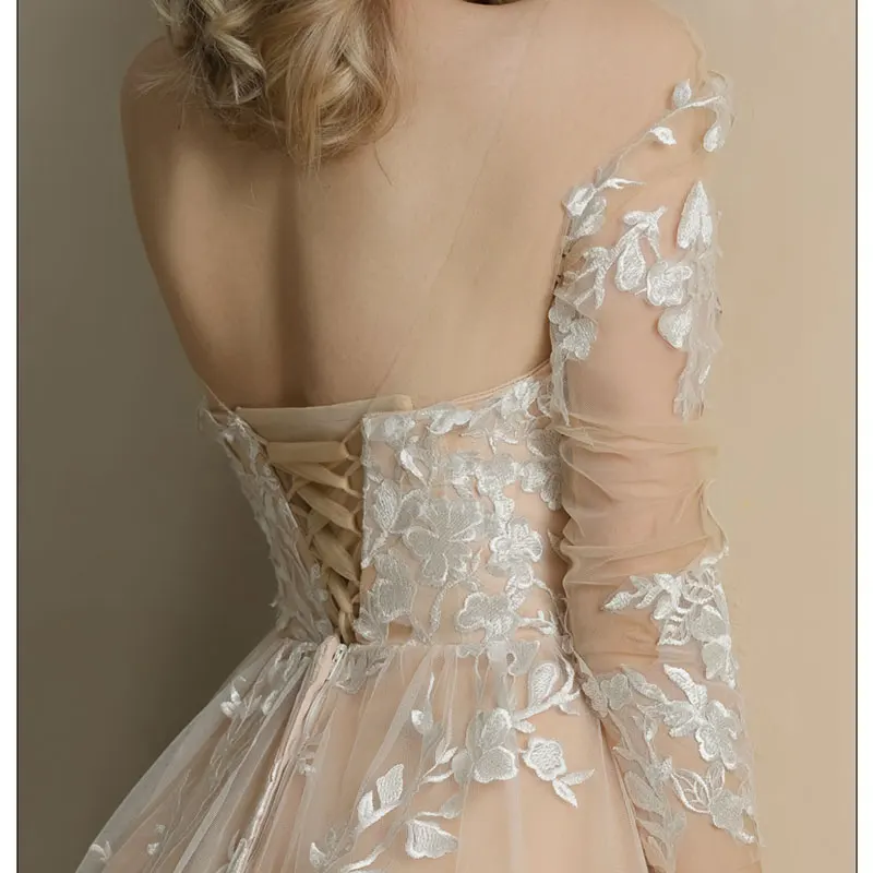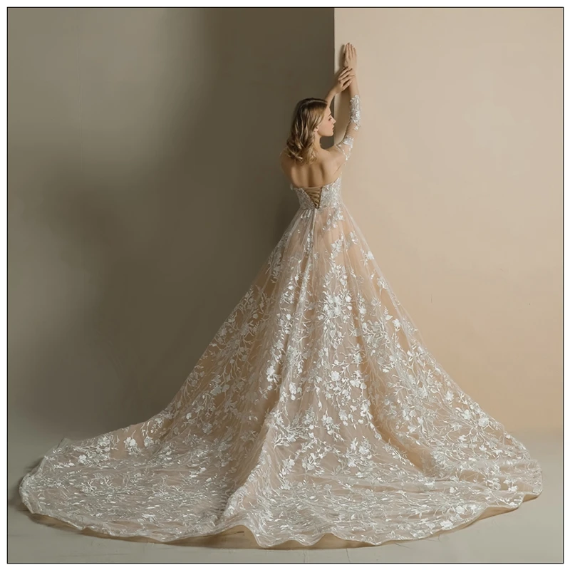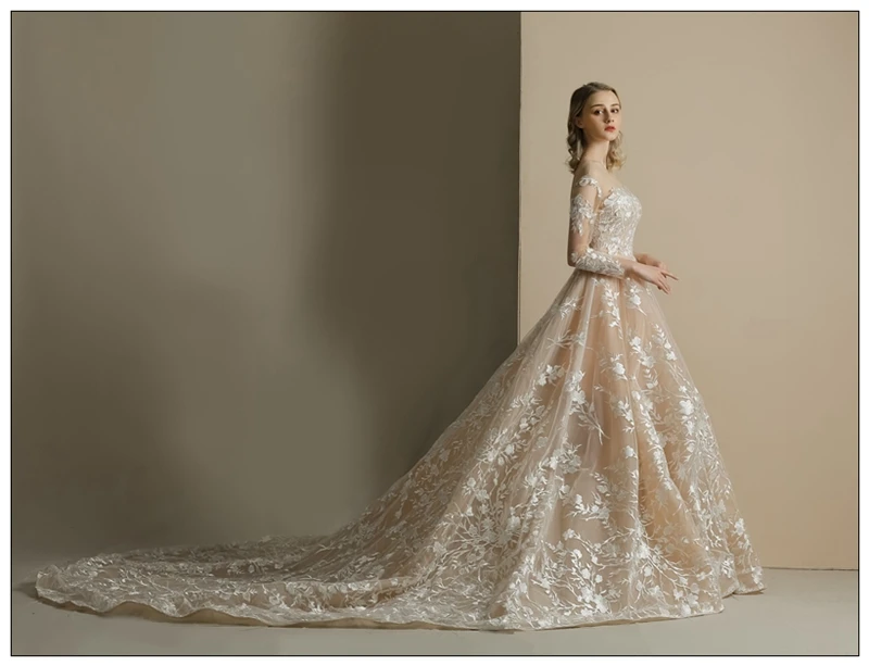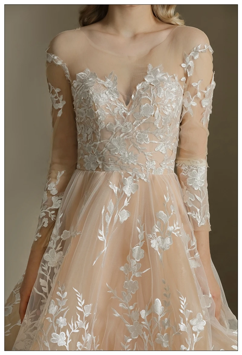 Кружевные свадебные платья цвета шампанского AE0013 с длинными рукавами и аппликацией, а-силуэт, длинное простое платье со шлейфом для невесты