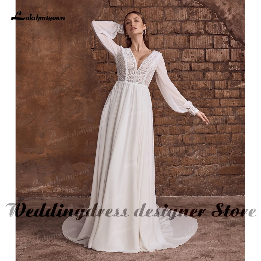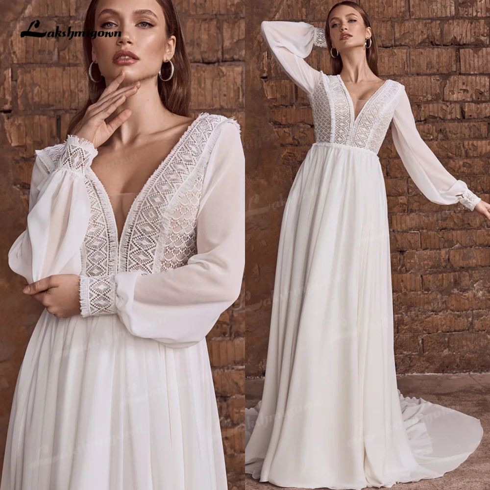 Свадебные платья-трапеции в стиле бохо с пышными длинными рукавами и V-образным вырезом, пляжные свадебные платья цвета слоновой кости, простое шифоновое свадебное платье, vestido de noiva 2022