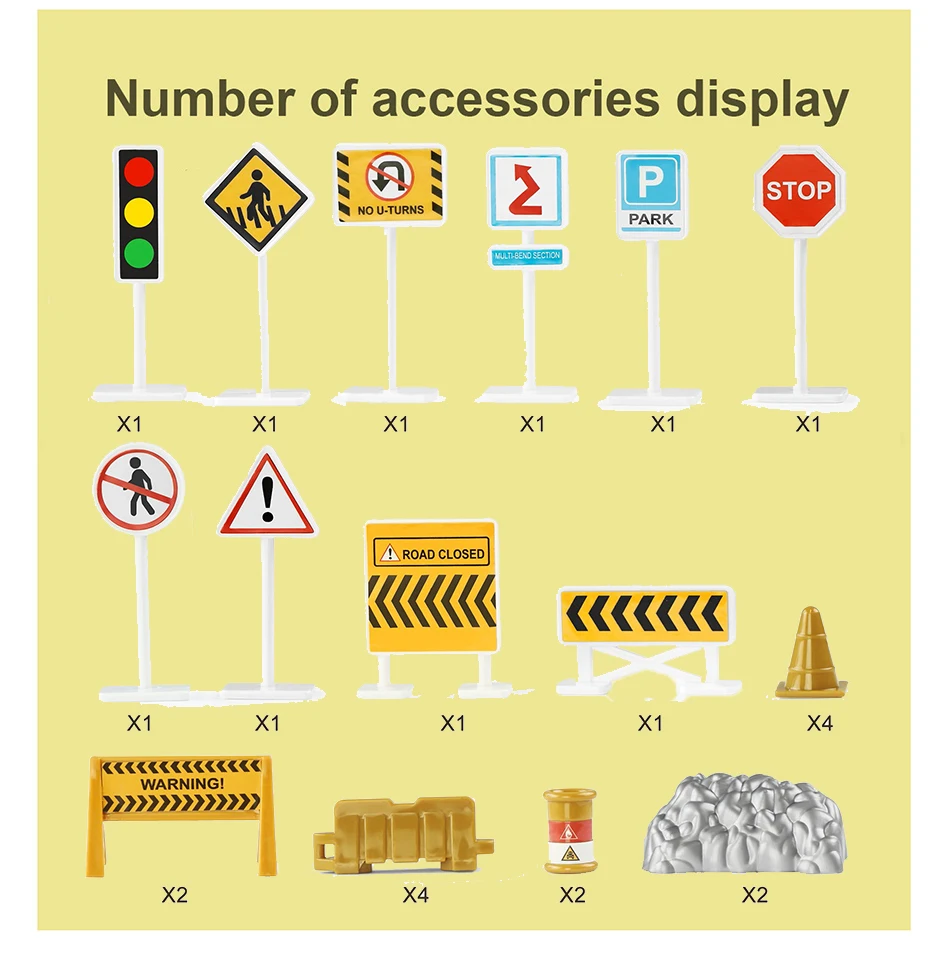 Автомобиль: 1 * бульдозер + аксессуары (1 * Запчасти для вилочного погрузчика, 1 * части для дорожного грузовика, 1 * части ролика, 1 комплект * дорожные знаки)B карта: 100x80 см (39,37*31,49 дюйма)C карта: 80*60 см (31,49*23,62 дюйма)