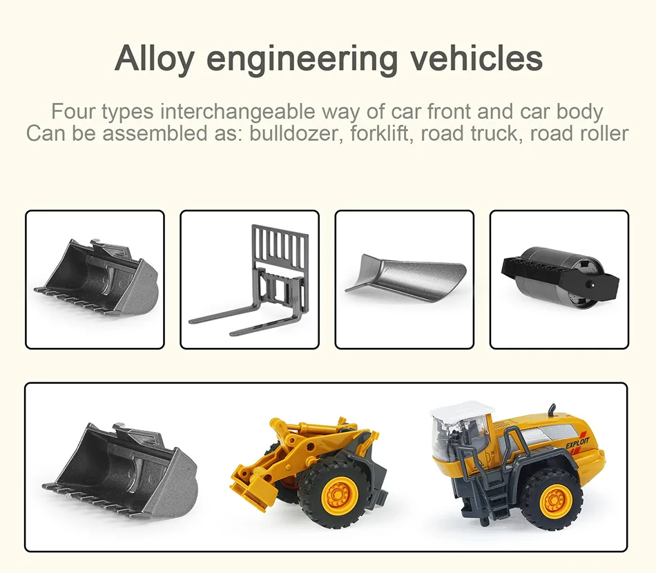 1. Многофункциональность: один корпус автомобиля с 4 передними частями может быть преобразован в 4 вида моделей, включая: бульдозер, вилочный погрузчик, дорожный каток, дорожный грузовик;2. Раннее Обучение: оснащен дорожными сигналами, дорожными знаками и другими частями, дети могут узнать некоторые жизненные знания во время игры.3. Лучший подарок: для любого малыша или маленького мальчика, который любит строительство. Прекрасный подарок на день рождения, День благодарения, Рождество для любящего ребенка грузовика.