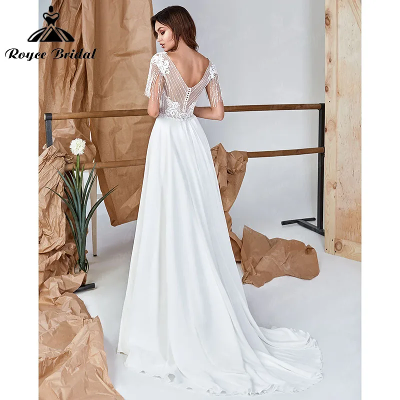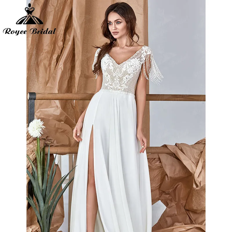 Пляжное свадебное платье в стиле бохо с V-образным вырезом и рукавами-крылышками, шифоновое кружевное платье-трапеция с разрезом и открытой спиной, Длинные свадебные платья, vestido de noiva 2022