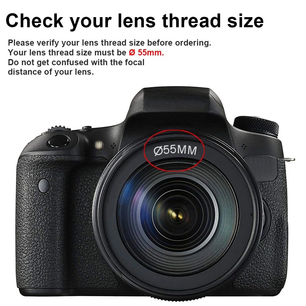 Особенности:-Конструкция «2 в 1 для широкоугольный и макросъемки.- Увеличивает поле зрения вашего объектива на 0,35 X. (E. g. 50 мм объектив превращается в 21,5 мм объектив б/у).-Изготовлено с многослойной стеклянной оптикой для четких изображений с высоким разрешением с минимальными искажениями и бликами.-Стальная конструкция для повышения долговечности.-Поддерживает полный Автофокус (AF), автоматическую экспозицию и возможности масштабирования.-Включает в себя объектив, макрообъектив, защитный чехол для объектива и колпачки.Инструкция:Легко привинчивается к передней части объектива и мгновенно расширяет поле зрения для захватывающей широкоугольной фотографии. Особенности съемного макрообъектива для очень высокого разрешения крупным планом мелких объектов.СовместимостьДля Nikon D3400, D5600 w/ AF-P DX NIKKOR 18-55 мм f/3,5-5,6G VRСовместимость Для Sony Alpha Series (SLT-A99V, A99II, A99, A77II, A77, A68, A58, A57, A65, A55, A 390, A100, A33, A900, A850, A700, A500, a330, A300 A230, A200) DSLR камеры с объективами 18-55 мм, 75-300 мм f/4,5-5,6, 50 мм f/1,4.Примечание:Перед заказом проверьте размер резьбы объектива камеры. Этот широкоугольный адаптер совместим только с линзами 55 мм. Размеры линз различаются независимо от бренда камеры или модели. Размер резьбы объектива вашей камеры будет отмечен где-то на корпусе объектива или напечатан под крышкой объектива. Ths number всегда имеет символ «Ø» (диаметр). Например: Ø55 = 55 мм Размер резьбы объектива.