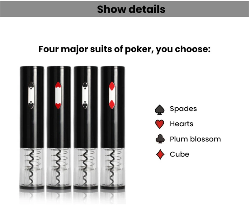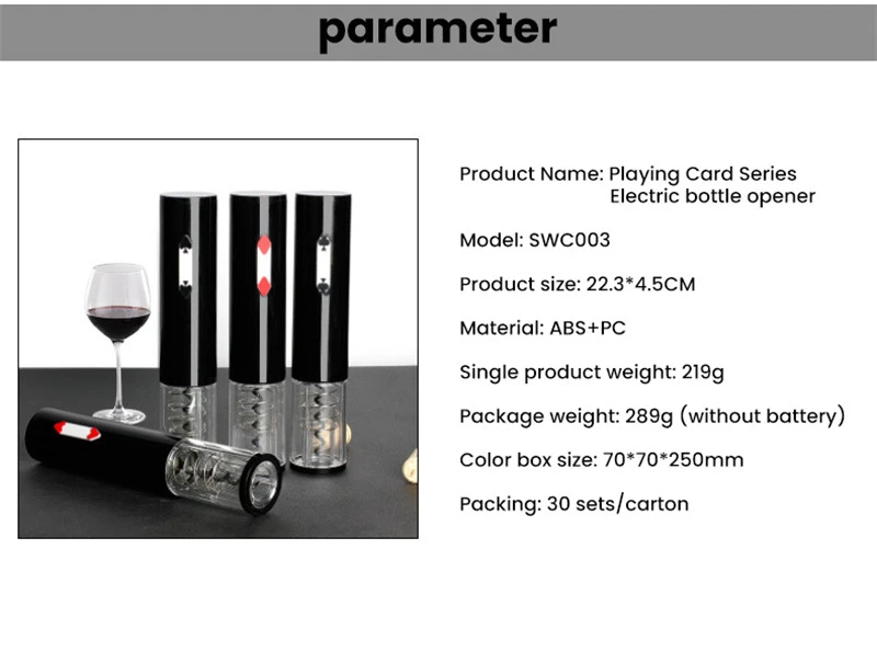 Особенности:-Сияющий цвет и модный внешний вид, вечерние, свадебные и домашние-Откройте вино за 6 - 8 секунд-Совместимость с перезаряжаемый аккумулятор и AA щелочная батарея (не включена)-Прозрачная крышка штопора для просмотра пробки-Пищевой винт, безопасный и прочный-Легко работающие кнопки для нажатия и вытяжки пробки-Корпус из алюминиевого сплава и прозрачная крышка из АБС-пластика-Низкий уровень рабочего шума менее 75 дБ-Мощность: 5 Вт-Номинальное напряжение: 6 ВТип металла: алюминиевый сплавТип открывалки: красное вино, винные открывалкиВес изделия: 0,358 кгПосылка:Посылка 1 (зарядка аккумулятора):1 Электрический Нож для вина, 1 фольга, 1 руководство пользователя на китайском и английском языках (без батареи)