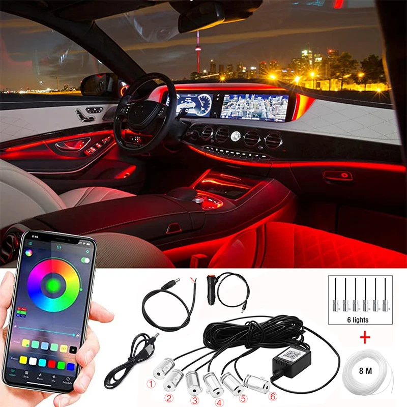 Светодиодная лента RGB 456 в 1 для салона автомобиля, декоративное освещение для ног, неоновое волокно, оптическая светильник вая лента, управление через приложение, DIY музыка