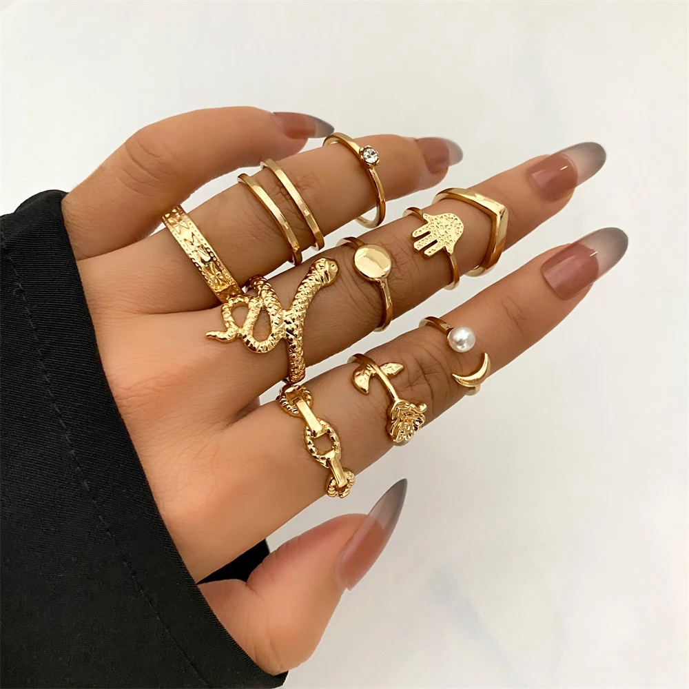 Набор золотых металлических колец IFME в стиле панк для женщин и мужчин, кольца на палец в виде змеи, сердца, цепи с камнем в стиле хиппи, модные ювелирные украшения для вечеринки, подарок