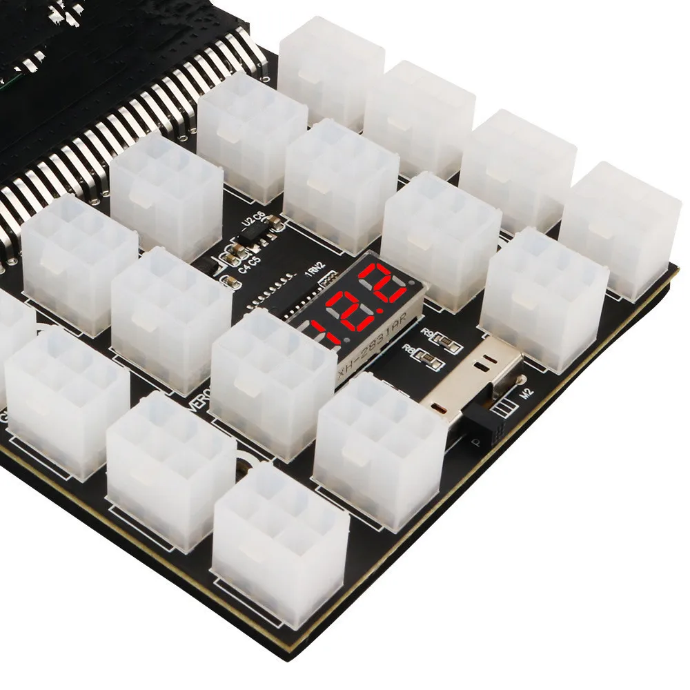 Параметры Название продукта: блок питания Breakout Board Adapter для ETH/BTC Mining Выходная мощность: 12 В Цвет печатной платы: черный Applicatioin: для майнинга видеокарты питания Особенности: 1. Максимальная поддержка до 120Amp / 2400 Вт 2. Электронный Переключатель ВКЛ/ВЫКЛ. Сохраняет свое состояние. 3. 17 портов PCIe, для 6pin разъемов 4. Бортовой светодиодный измеритель напряжения Вы получите: 1 x плата адаптера (не включая ATX 2*3Pin Кабель питания)