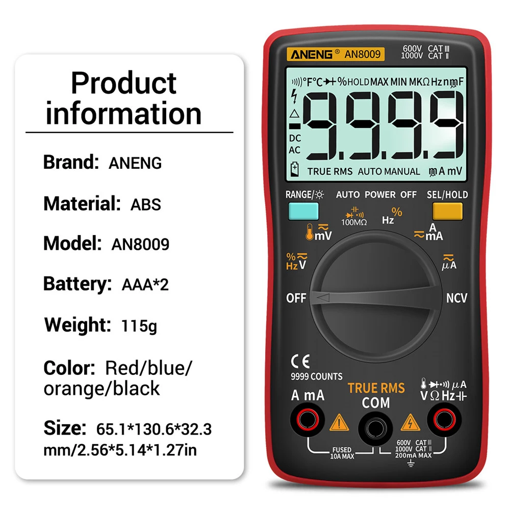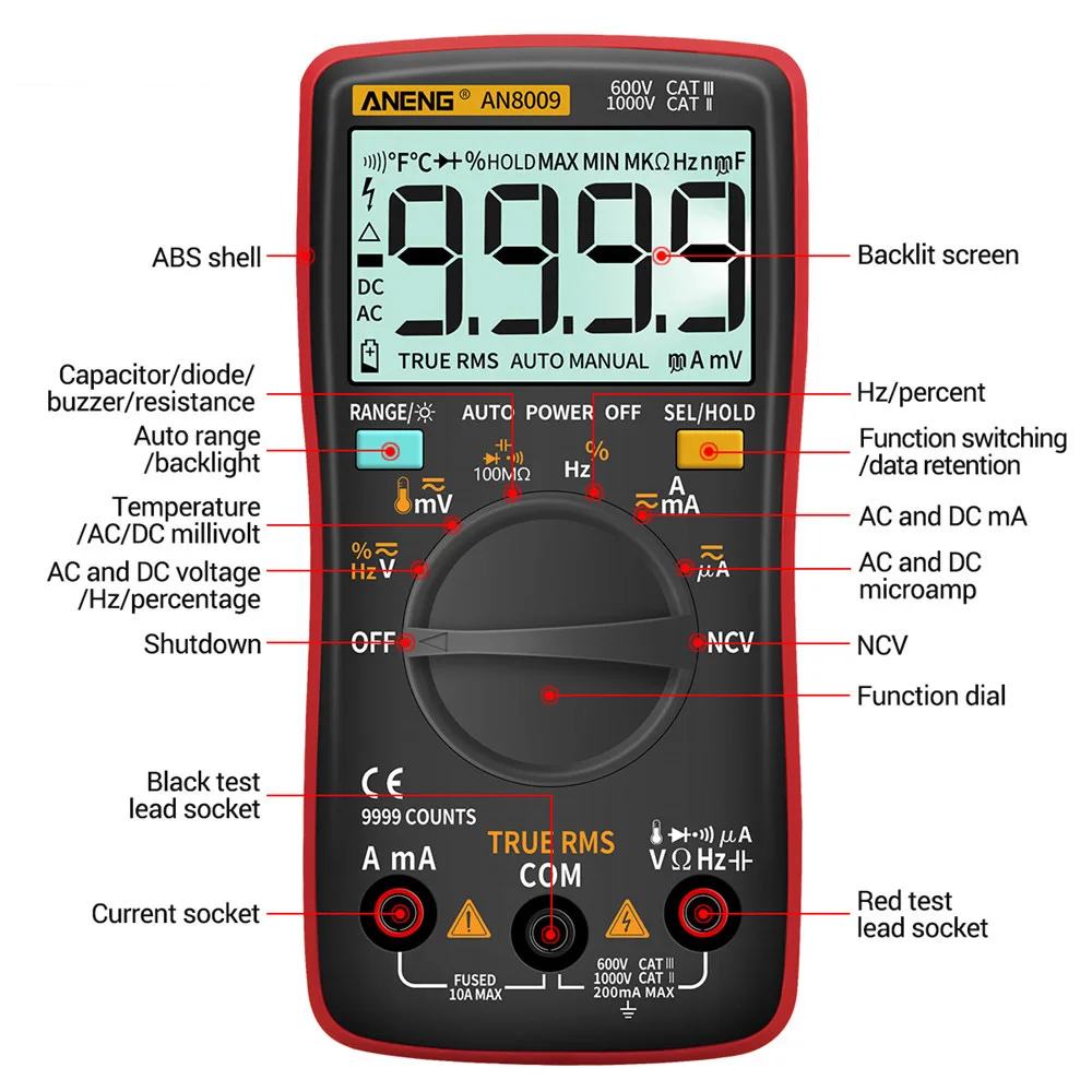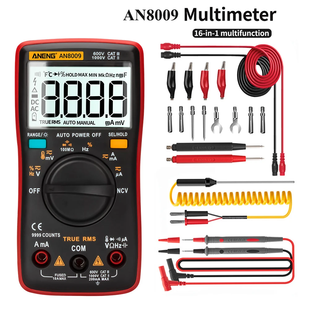 AN8008 мультиметр Цифровой 9999 отсчетов с подсветкой ACDC Амперметр Вольтметр Ом Транзистор тестер многометровый Авто Диапазон