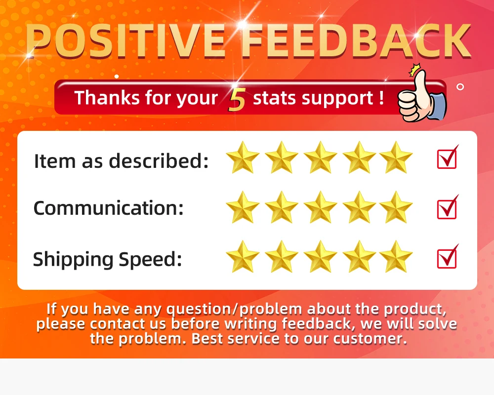 Мы поддерживаем высокое качество и стремимся к 100% удовлетворенности клиентов! Мы стремимся к звездному сервису и хотим, чтобы вы были счастливы.Если вы удовлетворены нашим обслуживанием и продуктом, мы будем очень признательны, если вы поставите нам пять звезд и положительный отзыв. Вы также можете рекомендовать его людям, которые в нем нуждаются. Если вы не удовлетворены, пожалуйста, свяжитесь с нами. Спасибо