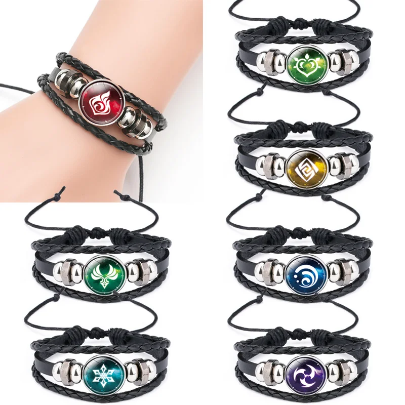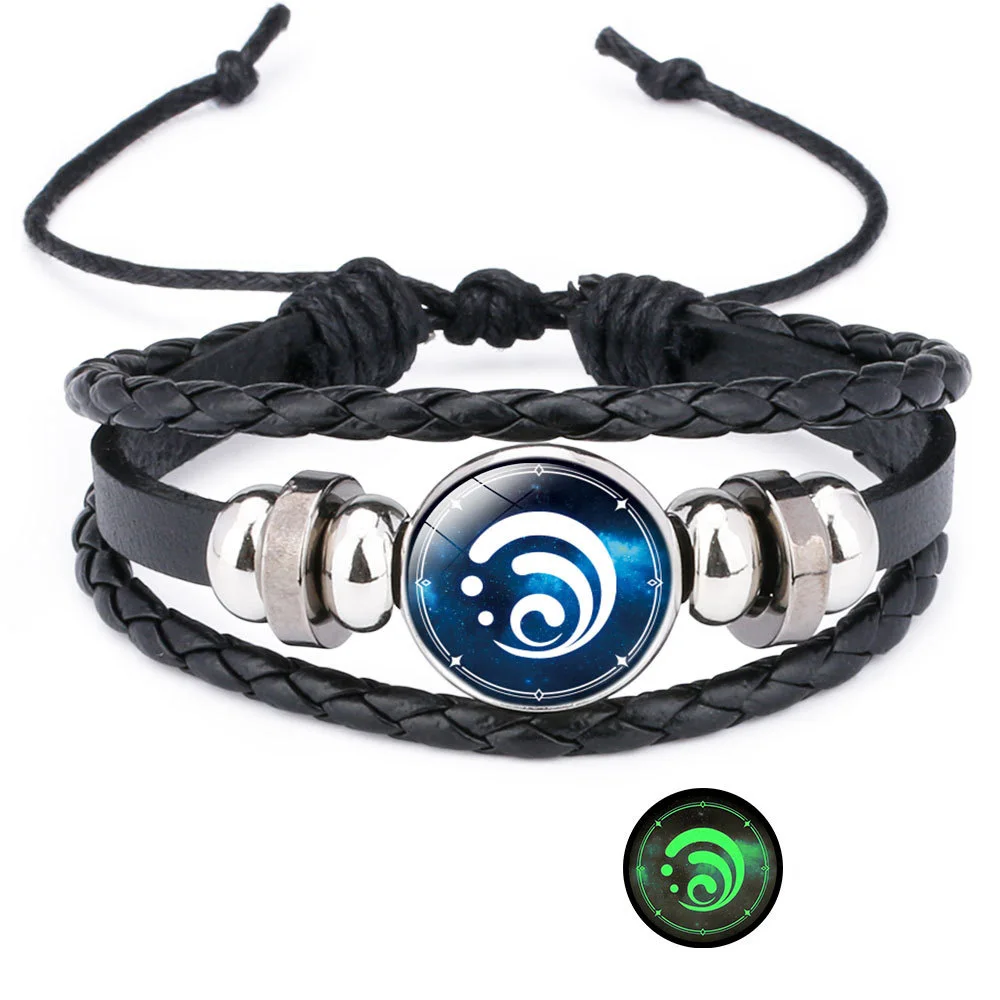 Светящийся ударный кожаный браслет Genshin, браслет с отверстиями глаза Бога, воды, ветра, гром, огнем, скалой, льдом, застежкой-кнопкой, браслеты, ювелирные изделия, подарок