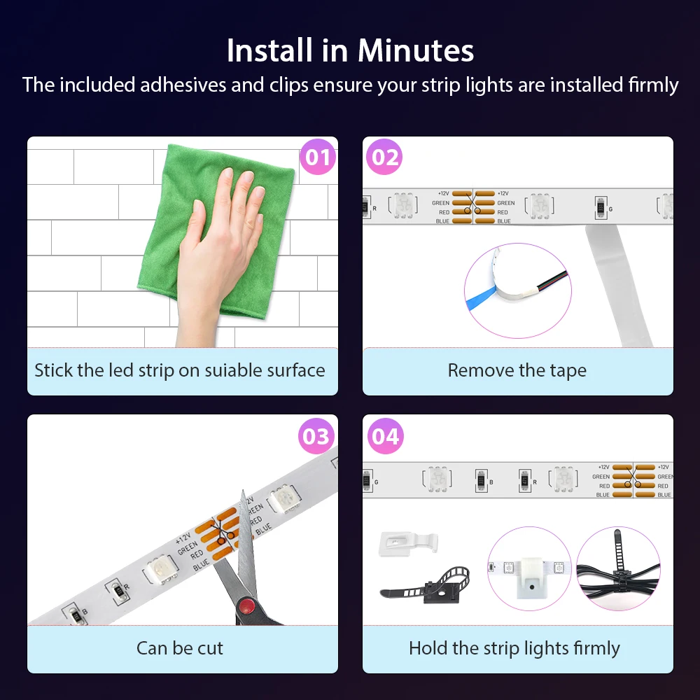 • Бесконечные цветовые варианты с регулируемой яркостью RGB• Bluetooth, Bluetooth/музыка и стандартные светодиодный полосы• Дистанционное управление через приложение и/или Bluetooth• Простота установки в 5-30 м/16,4-98,4 фута• Функция таймера для запланированного освещения