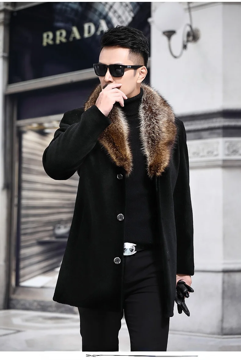 Черное мужское шерстяное пальто, однобортная утепленная ветровка средней и длинной длины, модная шерстяная мужская одежда с шерстяным воротником