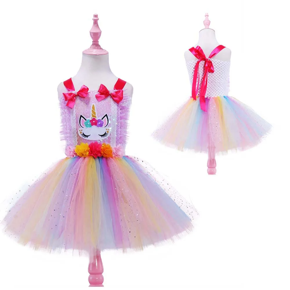 Блестящее Радужное Тюлевое платье-пачка для принцессы, вечерние для девочек с единорогом, детский костюм Пурим, сказочное платье на день рождения, элегантное бальное платье
