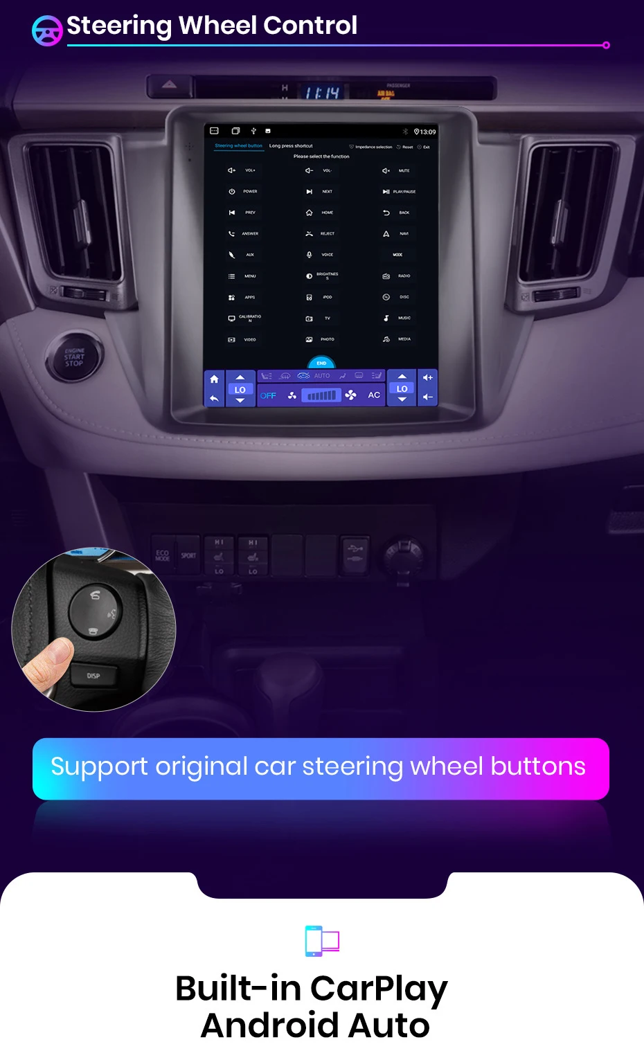 Встроенный беспроводной Carplay и Android авто функция, для беспроводной Carplay, вам просто нужно подключить к телефону с bluetooth; И для Android Auto, вам нужно только использовать usb-кабель для соединения телефона и радио, управления и управления мобильными телефонами через устройство, откройте безопасную жизнь вождения.