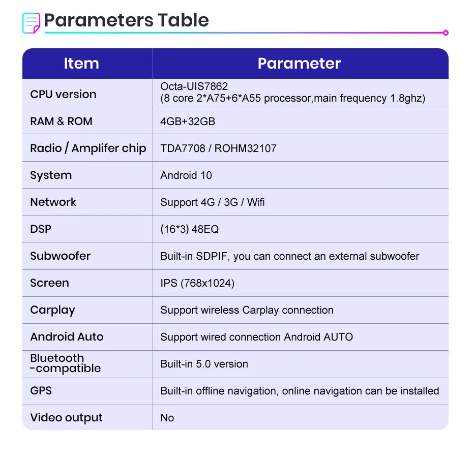 > Основные функции: Android 10,0 + 9,7 дюймов IPS Экран + 8 ядро 1,8 ГГц + DDR3 2 ГБ флэш-памяти (2 ГБ/4 Гб опционально) + память 32 ГБ + WIFI и сеть 4G + зеркальная связь + управление рулем + RDS> Специальные функции:1. Штифт-штифт: Кабель питания Junsun radio' является штифтом для штифта, прост в установке;2. Встроенный Carplay/ Android авто: Поддержка беспроводной carplay; Просто используйте телефонный кабель для подключения Android Auto, стабильный и простой в использовании;3. Цифровой звуковой процессор DSP с (16*3) регулировкой эквалайзера 48 эквалайзеров для лучшей музыки. Это не только звук, но и высококачественная стереосистема. Улучшите качество звука, улучшите басы и получите высококачественные звуковые эффекты.Дополнительные аксессуары> Голосовое управление AI: только Junsun поддерживает функцию, просто скажите, что командное слово контролирует радио без рук, делает привод более безопасным;> ADAS DVR, контроль давления в шинах, OBD2, > OSD языкРусский, английский, испанский, итальянский, французский, чешский, арабский, немецкий, иврит, китайский, эстонский, польский, филиппинский, финский, корейский, голландский, хорватский, латышский, литовский, румынский, норвежский, португальский, японский, шведский, тайский, турецкий, украинский, венгерский, словацкий, датский, словенский. > Отличное обслуживание клиентовВ Junsun Наша цель-продолжать усердно работать, чтобы сделать инновационное оборудование и программное обеспечение автомобильного мультимедийного плеера радио, чтобы дать вам этот индивидуальный опыт.Мы предоставляем обновления для прошивки, программного обеспечения, gps-навигационных карт бесплатно.