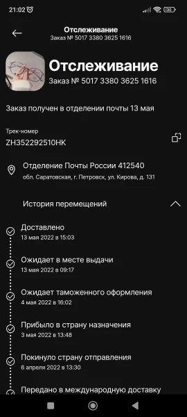 Страна: ES Frame Color: purple Eye Prescription: +400 Доставка: Cainiao Expedited Economy 21.04.2022