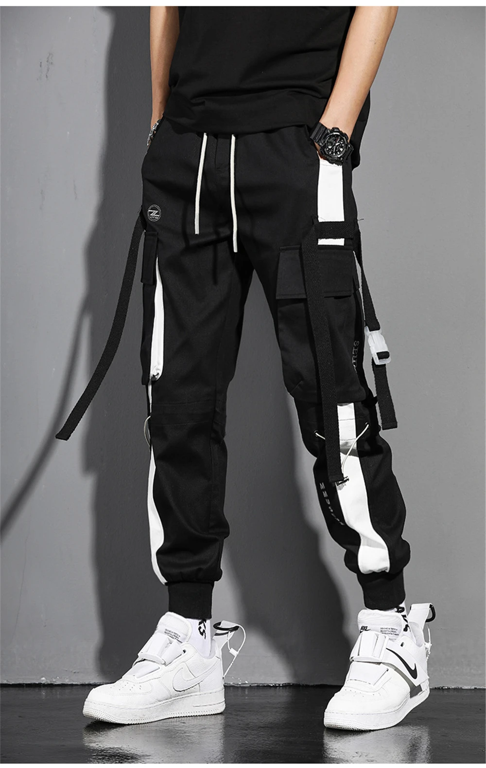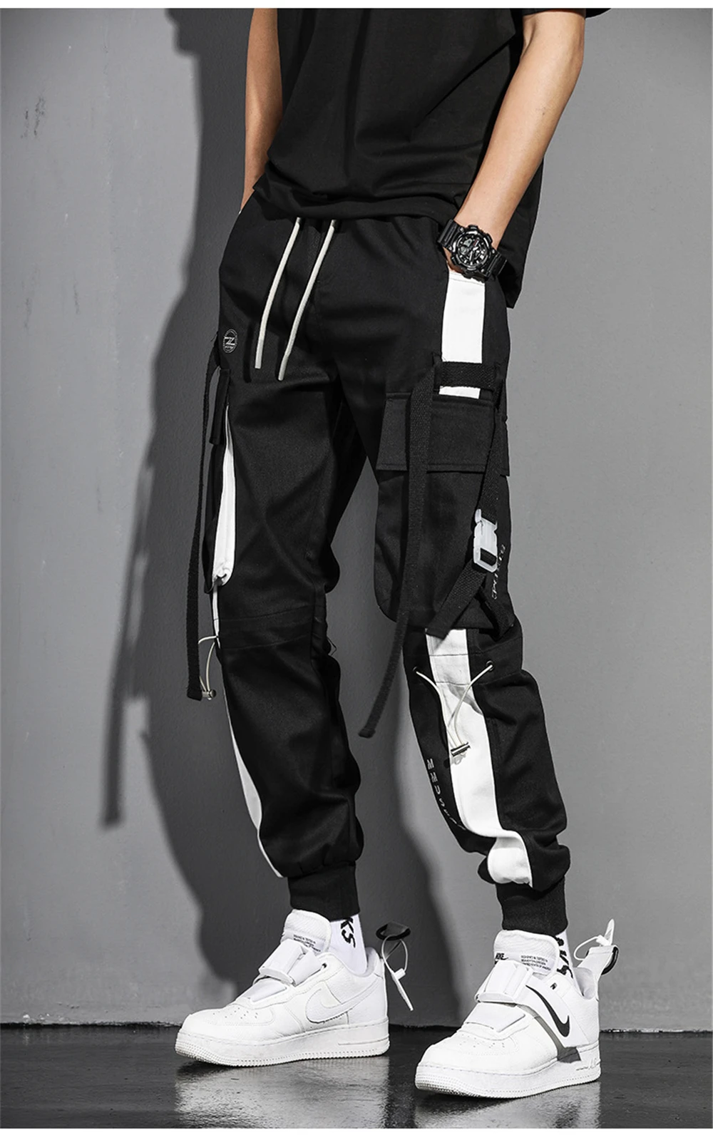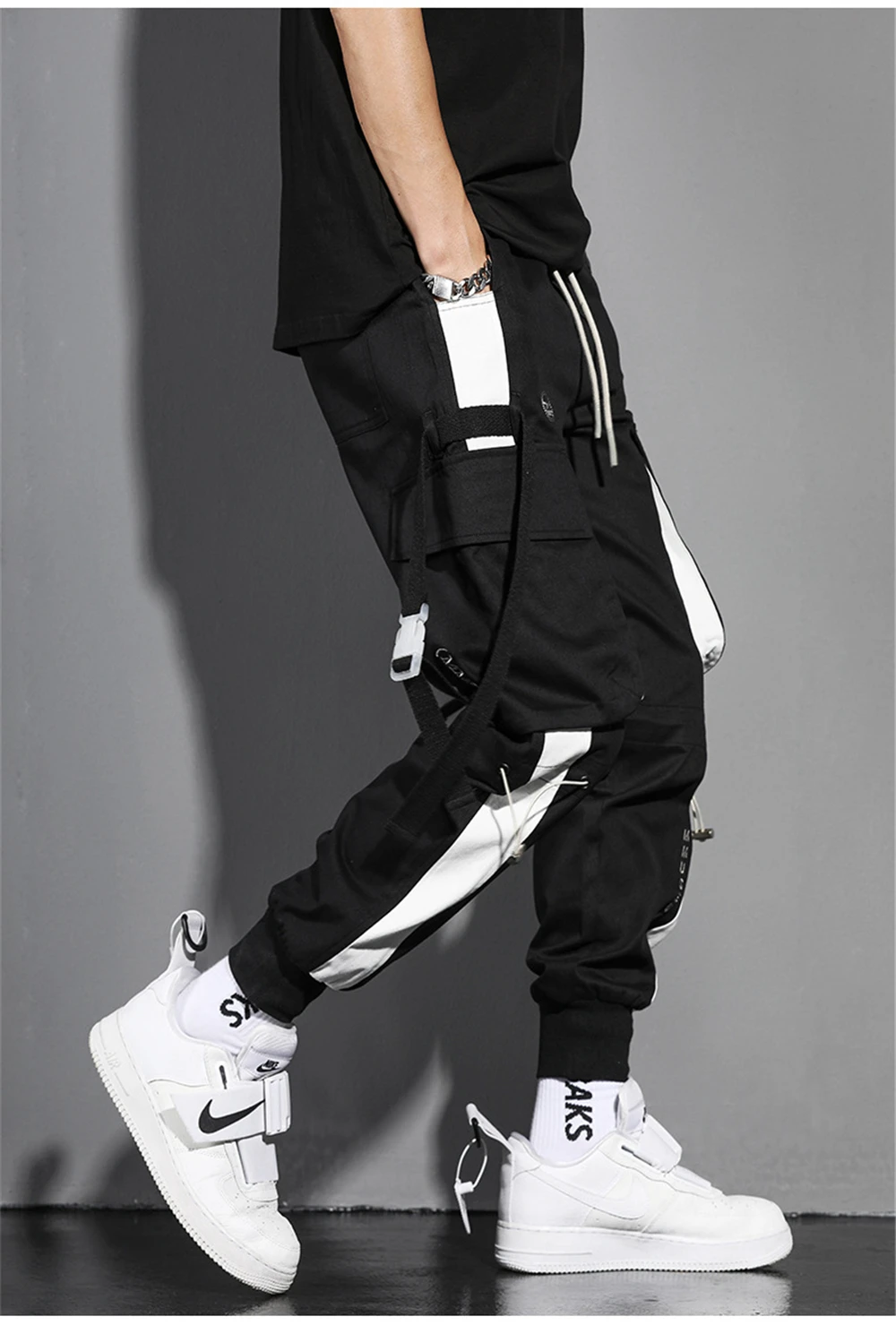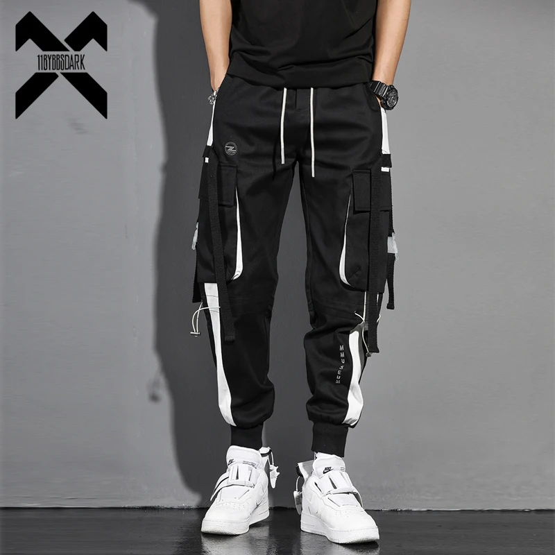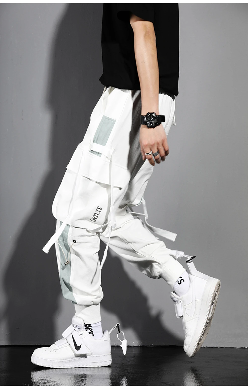 Брюки-карго мужские с лентами, тактическая уличная одежда в стиле хип-хоп, штаны в стиле пэчворк с эластичным поясом, Джоггеры со множеством карманов, черные белые WB510