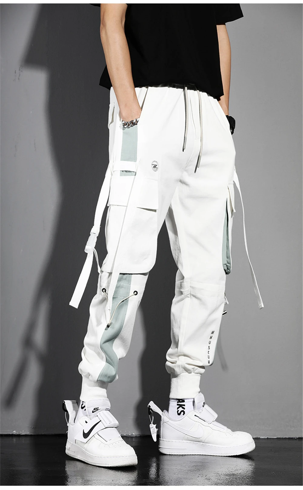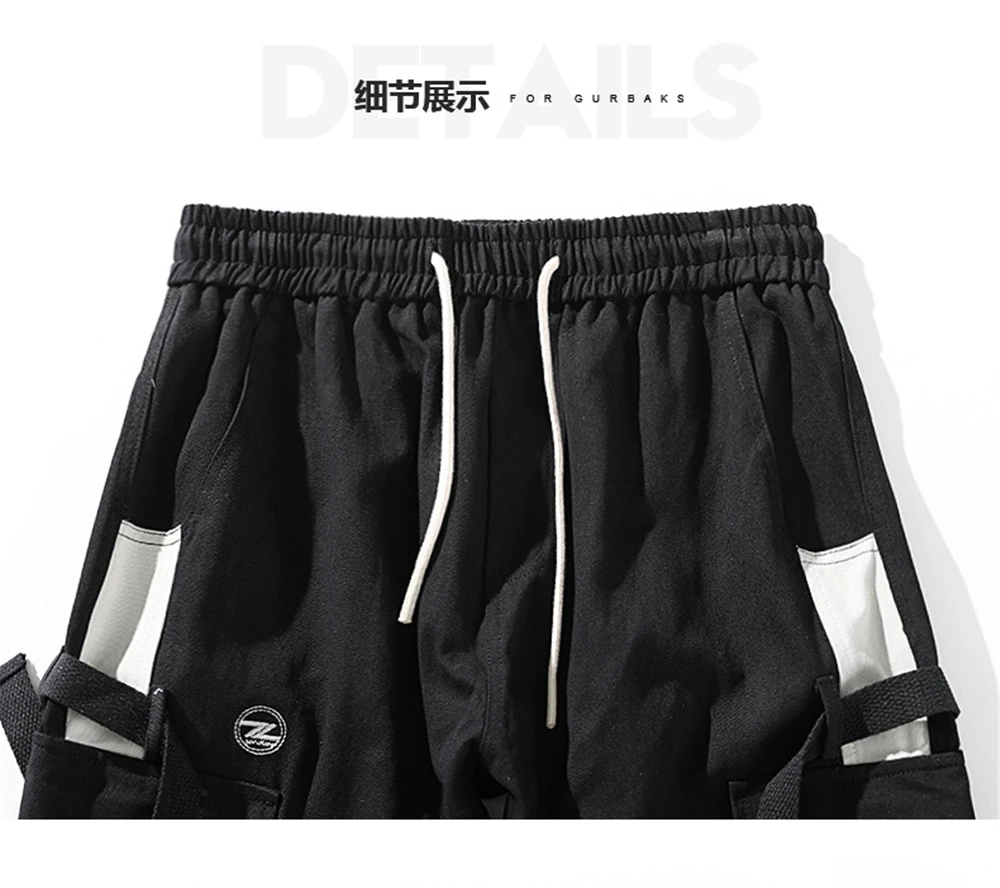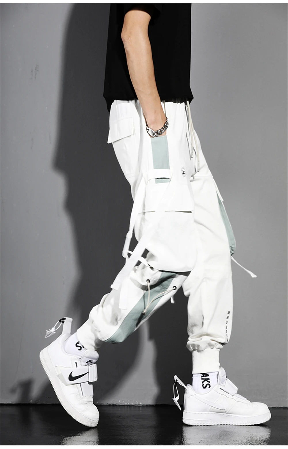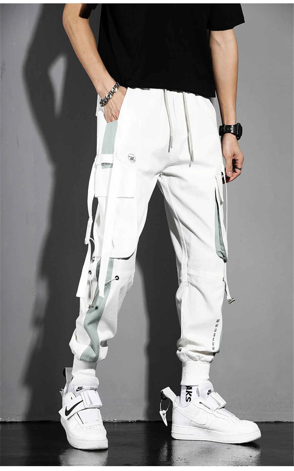 Брюки-карго мужские с лентами, тактическая уличная одежда в стиле хип-хоп, штаны в стиле пэчворк с эластичным поясом, Джоггеры со множеством карманов, черные белые WB510