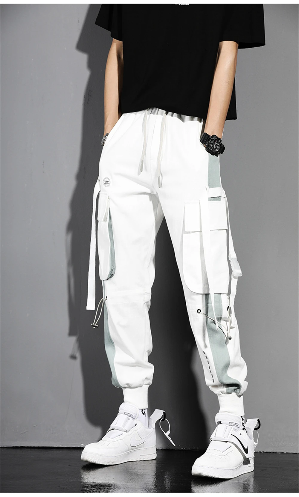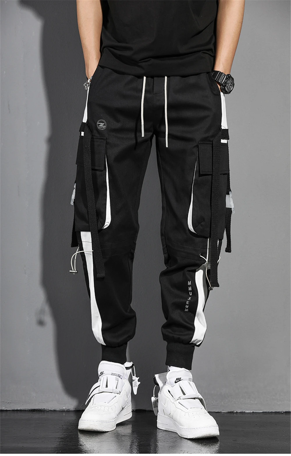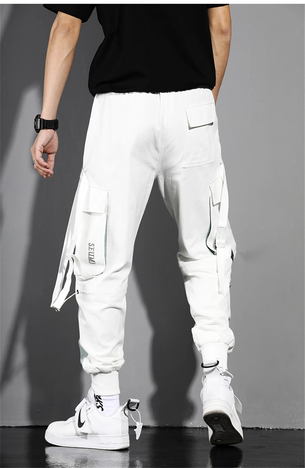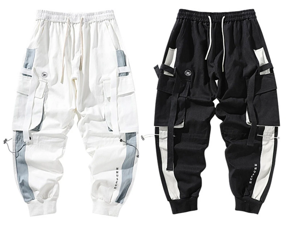 Брюки-карго мужские с лентами, тактическая уличная одежда в стиле хип-хоп, штаны в стиле пэчворк с эластичным поясом, Джоггеры со множеством карманов, черные белые WB510