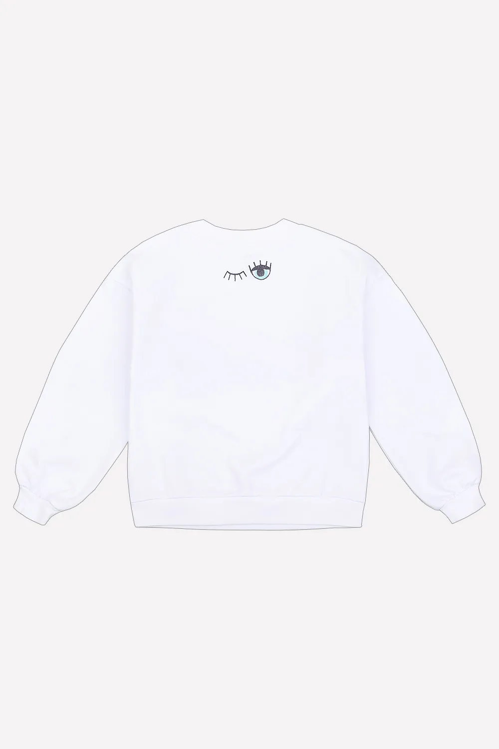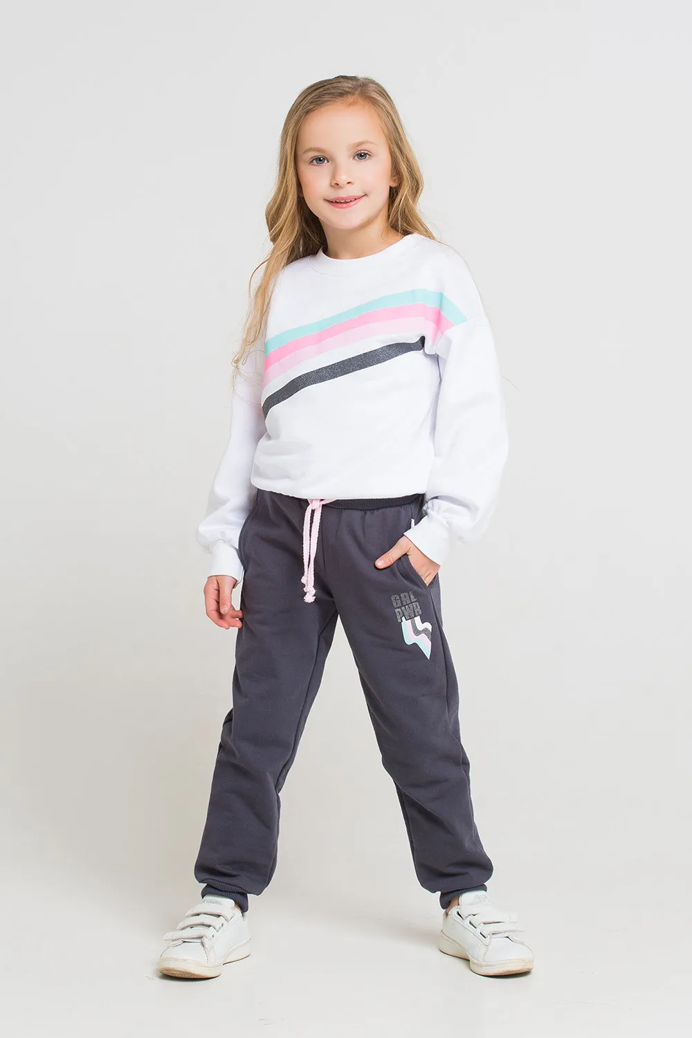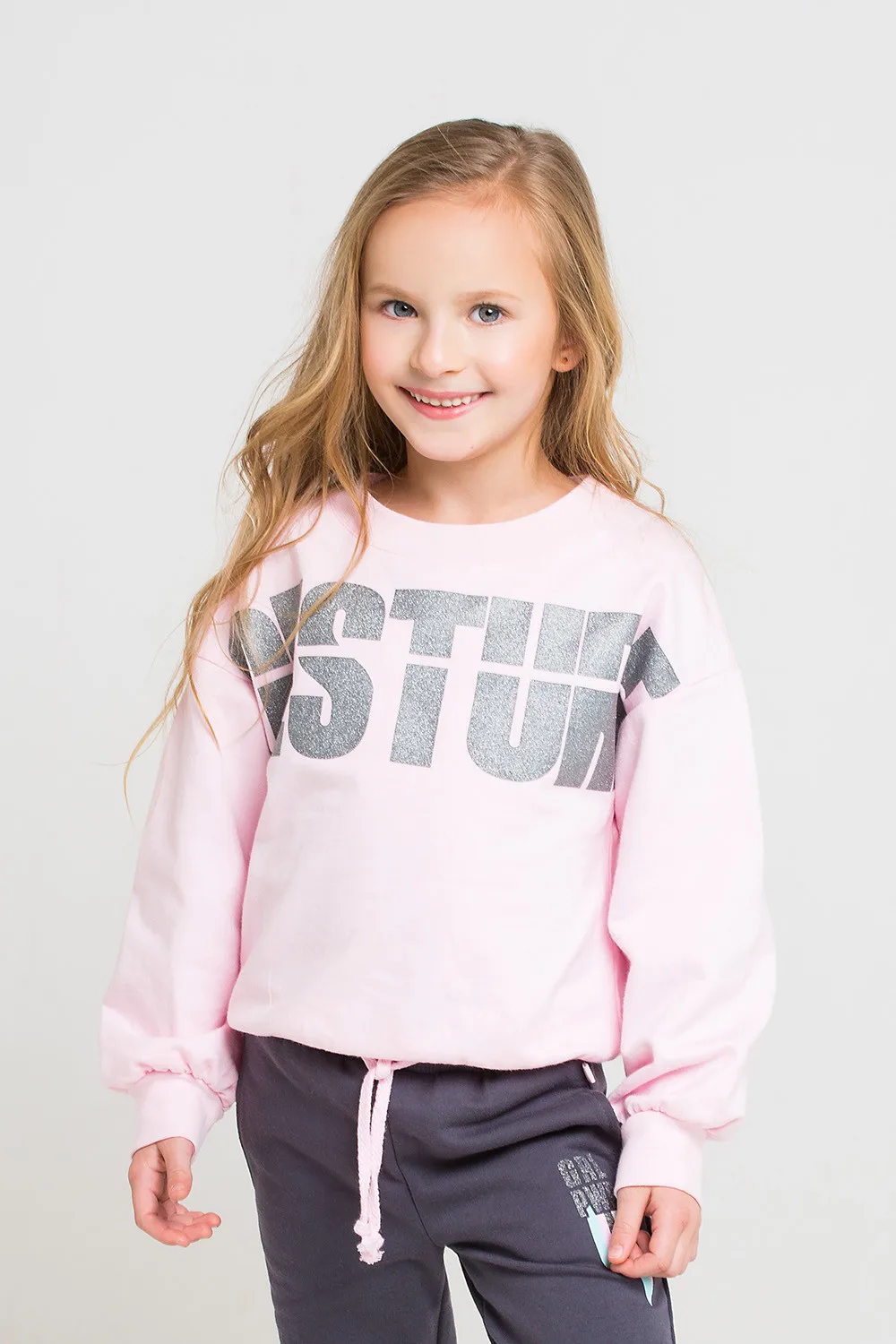Описание: Толстовка для девочки из футера. На полочке принт с блестками. Длинные объемные рукава со спущенным плечом и сборками по низу. Горловина, манжеты и пояс выполнены из хлопка с лайкрой. Застёжка на 2 кнопки в области плеча.