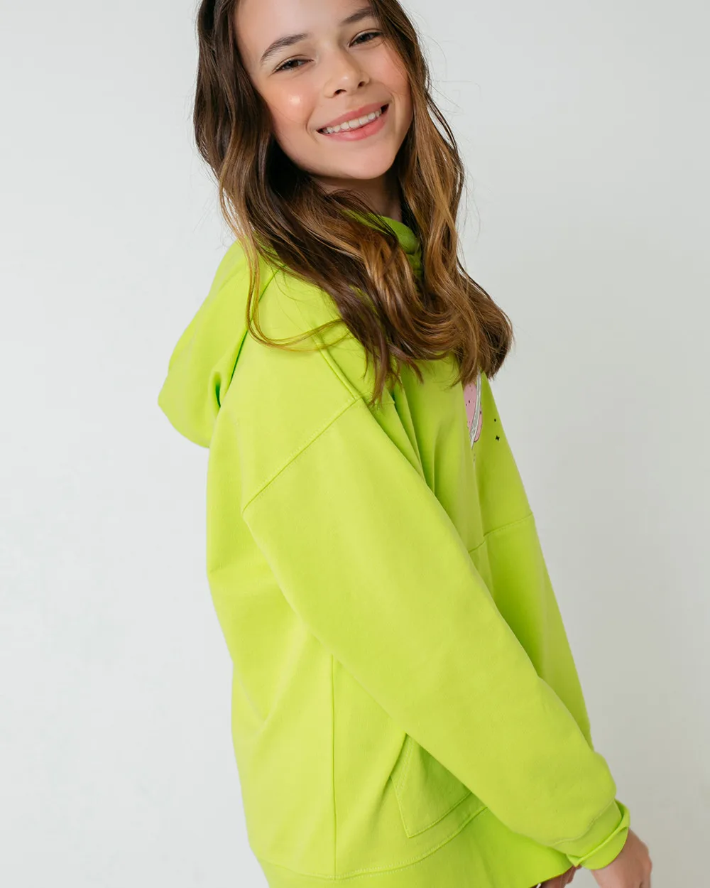 Описание: Однотонный джемпер с капюшоном для девочки. Сшит из тёплого футера с начёсом. Спущенные плечи придают свободный объём. На животе вместительный карман-кенгуру. На рукавах - эластичные манжеты. Внизу - мягкий пояс. Украшен принтом с изображением планеты.
