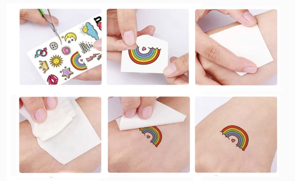 1. Вырежьте татуировку на выбор и удалите прозрачный лист.2. Нанесите татуировку на кожу.3. Намочите татуировку губкой.4. Через 20-30 секунд Аккуратно удалите подложку.5. Позвольте татуировке высохнуть.
