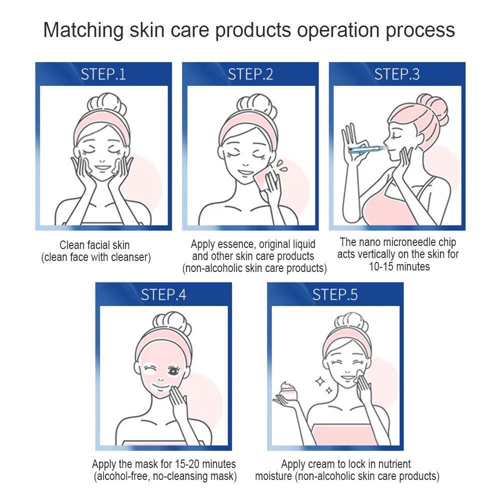 Точечный метод:После того, как Нанокристаллический чип установлен на нанокристаллической пластине и вертикально касается поверхности кожи, можно визуально заметить, что имеется небольшое углубление, а скорость, плотность, И мягкость поднимается один за другим. Отрегулируйте прочность в соответствии с контактной областьюМетод скольжения:После того, как Нанокристаллический чип установлен на наночипе, он перпендикулярно контактирует с поверхностью кожи, и небольшое углубление может быть визуально наблюдено, чтобы скользить по прямой линии. При скольжении нано-пластина не оставляет поверхности кожи, и та же часть рекомендуется хранить в течение 3-5 секунд, а количество не превышает 2 раза.Метод круга:После установки нанокристалла на нанопластине и перпендикулярно поверхности кожи, визуально можно наблюдать ощущение депрессии, а нанопластинка не оставляет поверхность Кожи в то же время, и одна и та же часть рекомендуется оставаться на 3-меньше и количество раз меньше, чем в 2 раза. Различные проблемы кожи использовать шаги и рекомендации продуктаСухая, чувствительная кожа:Перед использованием различных функциональных продуктов три раза раньше вводите увлажняющий продукт (Гиалуроновая кислота увлажняющая маска), а затем вводите функциональный продукт после того, как кожа не обезвожена. Введите небольшой диапазон, прежде чем вводить функциональный продукт, и используйте его на всем лице без таких признаков, как покраснение, зуд, И т. Д. Пожалуйста, используйте не-чистый тип увлажняющие продукты в срок после импорта.Пятнистая проблема кожи:Рекомендуется использовать эссенцию от акне с увлажняющими продуктами (например, с отбеливающим пятном) для кожи, подверженной акне: ее можно вводить с продуктами от акне. Сама кожа акне имеет воспаление. Рекомендуется не использовать его по всей поверхности при импорте. Он должен быть введен только в области акне, чтобы избежать инфекции других частей лица.Акне акне печать введение Примечание:Он может быть введен с акне продуктов в сочетании с лиофилизованным порошком. Сначала используйте лиофилизированный порошок для введения следов от акне. При импорте, вы должны обойти операции акне, чтобы избежать инфекции, и, наконец, представить продукты акне вертикально на акне.Специфические методы работы акне ЯМЫ:
