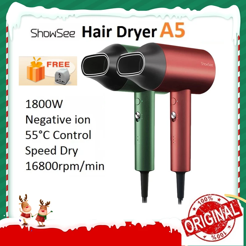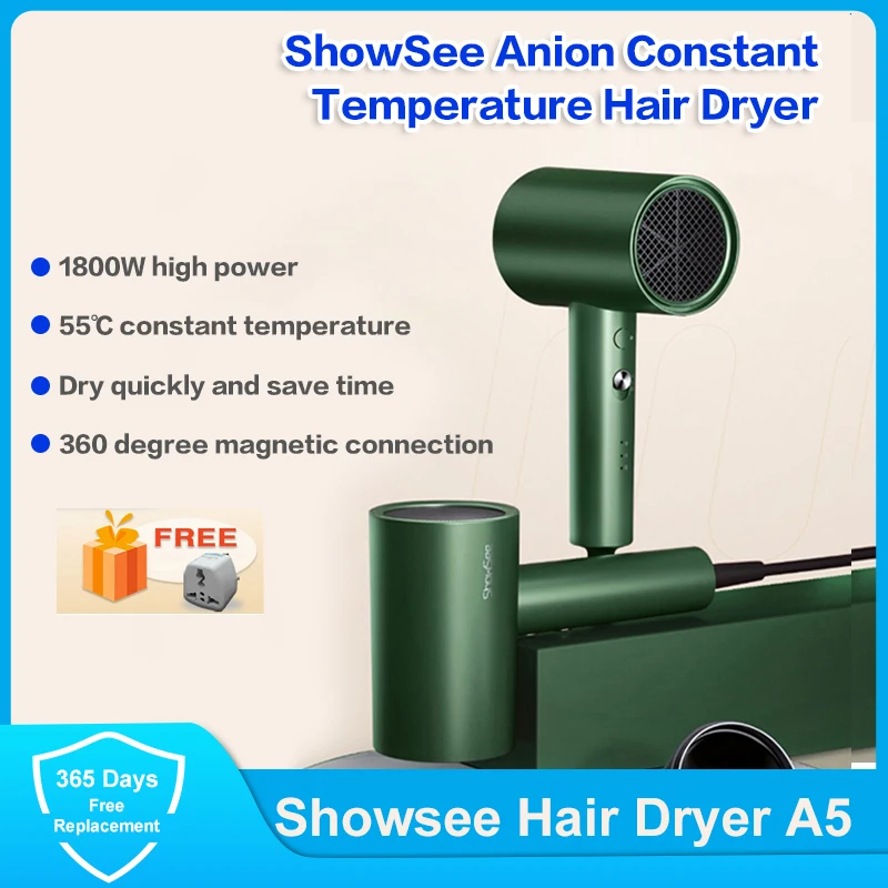Фен для волос ShowSee с отрицательными анионами, 1800 Вт, сильный ветер с рассеивателем, профессиональный фен зеленого цвета с горячим и холодным воздухом