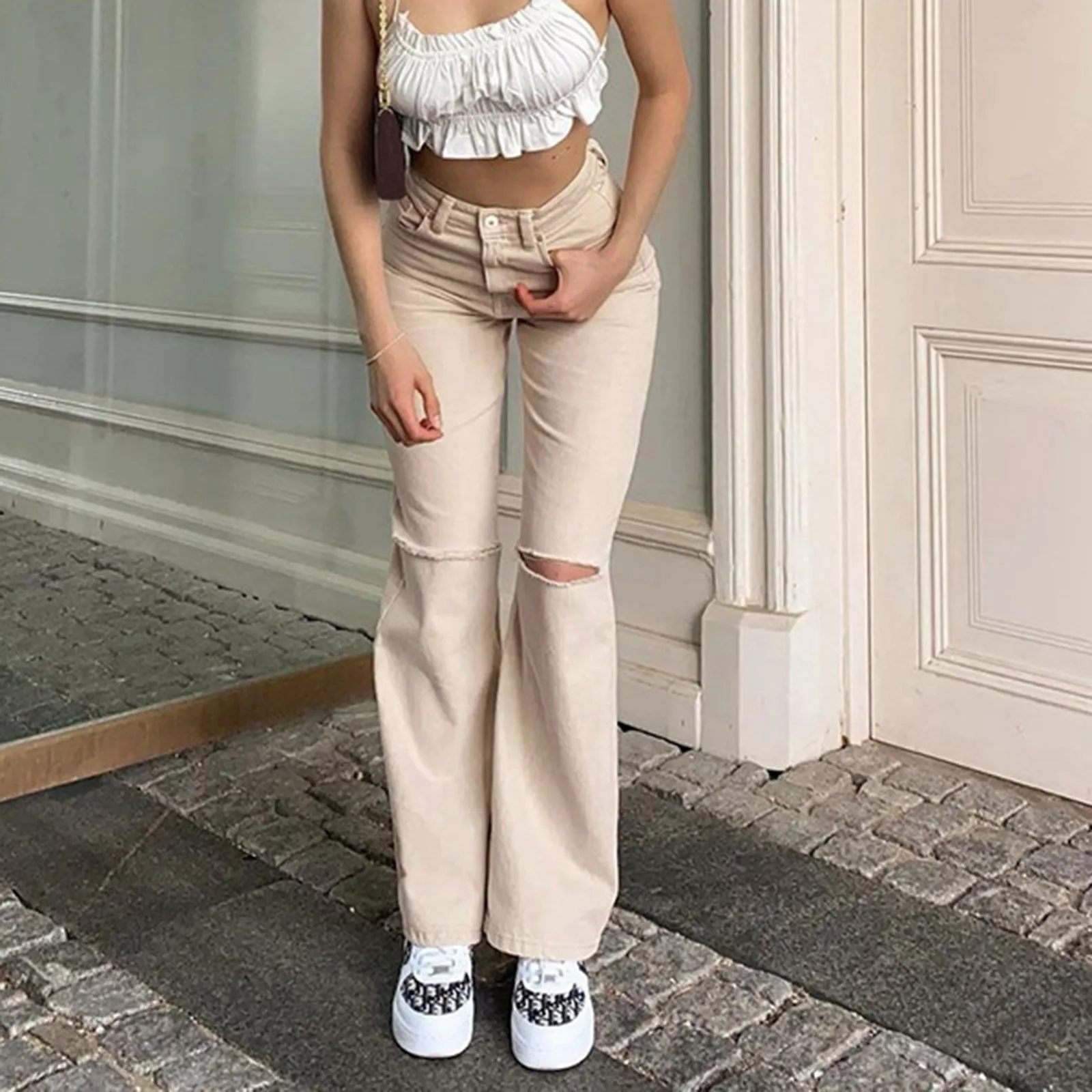 Женские джинсы с завышенной талией, повседневные Прямые брюки до колена с вырезами, облегающие эластичные брюки, уличная одежда, Новинка осени 2021