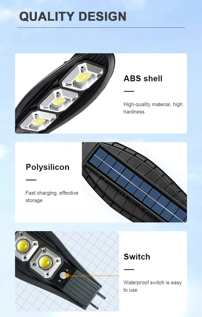Модель продукта: светодиодная Солнечная лампа COBЛегкий материал корпуса: поликарбонат + АБСХарактеристики панели солнечных батарей: монокристаллический кремний 5,5 В 1,43 ВтХарактеристики аккумулятора: 18650 литиевая батарея 3,7 в 2400/3600 мАч с защитой от заряда и разрядкиВыходная мощность: 5 В/7 ВтВремя зарядки: 6 часов на солнцеУгол чувствительности PIR: 360 градусовРасстояние срабатывания: 10 метров